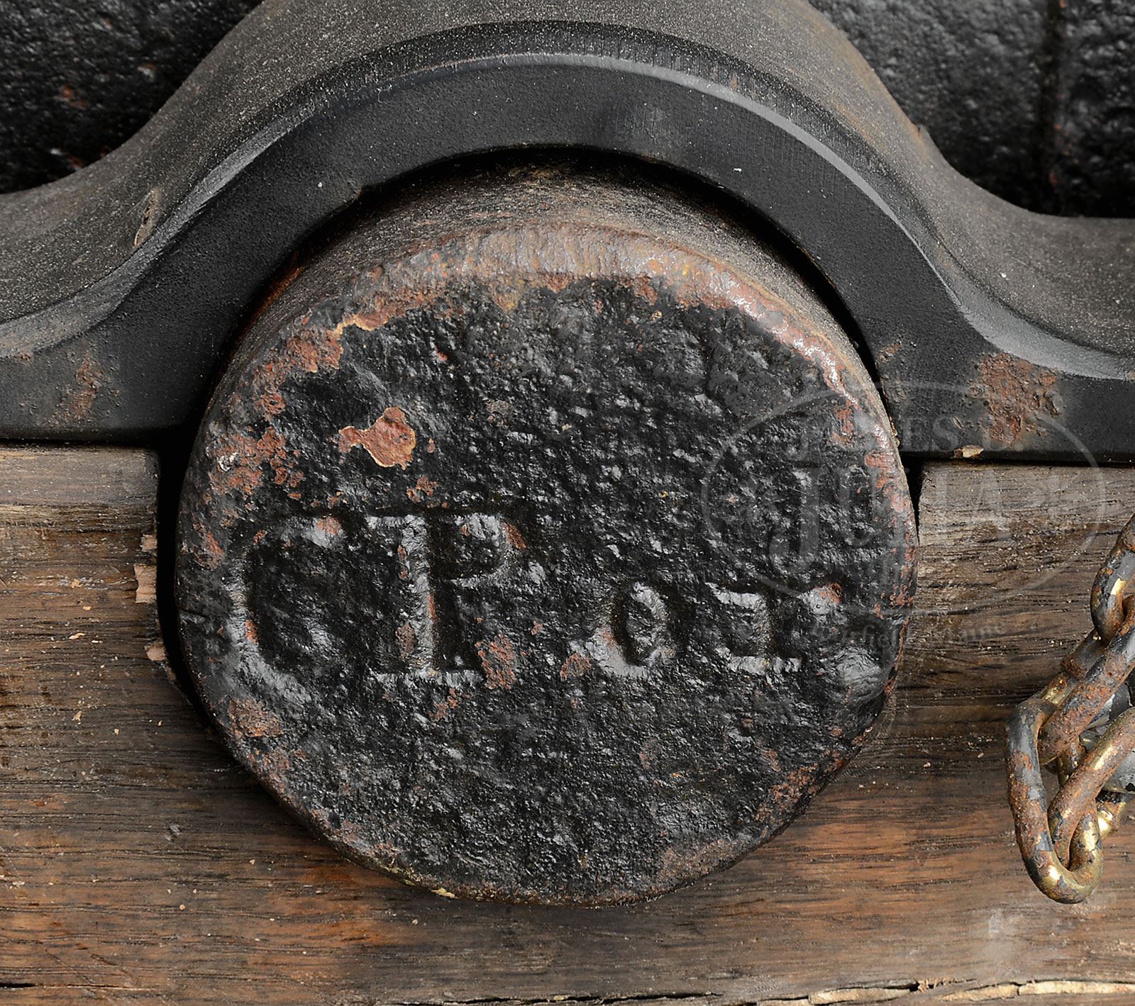 ENGLISH 6-POUNDER SHIP’S GUNADE CIRCA 1820.SN NSN. This is a fine example of a cannon commonly found on early 19th century merchant ships where insurance requirements required a gun for protection from pirates or other threats. The US Navy also had a number of 6-pounder gunades nearly identical to this one. Captain Thomas AP Catesby Jones, in his 1833 report included in the Congressional “Rep No. 141” entitled “National Foundry” describes six of them he inspected at Gosport Navy Yard, VA, in 1833: “From 1 to 6 inclusive, are 6 pound gunades; all have breech rings, have trunnions below the centre”. On the same page (pp. 183) Jones writes regarding the English-made iron gunades “…will answer as boat guns” Therefore we would expect that such gunades would have been used as boat guns (cannons mounted in the bow of a ship’s launch) during the Mexican War- only about a decade after Jones’ report was published. This particular gun is in beautiful condition, well marked, and displays well on a stepped Naval carriage. PROVENANCE: Richard Spicer Collection; Springfield Arsenal, LLC Artillery Collection. CONDITION: Cannon & carriage measure about 51″ l x 28″ h overall; tube is 38″ with a 33″ bbl length; swaged muzzle tapers to about a 4″ bore. Markings on top of bbl near breech are crisp & clear “B.P.& Co.” (Bailey & Pegg), a well known English cannon maker, Bailey, Pegg & Co. were founders in London between 1812-1966 initially at the Gunwharf, Wapping, and later at 81 Bankside, SE1. Weight is also marked above breech “4.0.23” which translates to 471 lbs. Cannon has iron patina, with pitting, bore is pitted & flaking. Carriage, including removable quoin, is sound & solid with iron & steel hardware. Wheels are poor with varying degrees of loss & rot but easily restored. 4-54167 (3,000-5,000) – Lot 2058