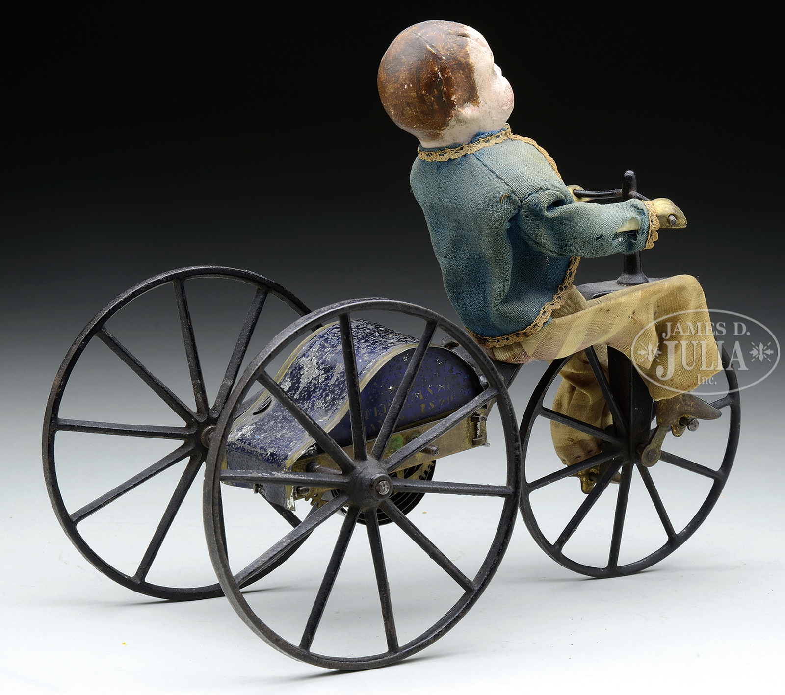 ALTHOF BERGMANN CLOCKWORK TRICYCLE.A classic early American tin clockwork toy with patent dates from the 1870s. This young gentleman sits upon the bicycle seat with the clockwork mechanism directly behind him encased in a fanciful painted stenciled tin covering. Overall this toy is in very fine original condition including the boy’s clothing which has some fading and minor distress. As opposed to the previous lot, this is key wound as opposed to being “backwound”. SIZE: 11″ l. CONDITION: As stated above. 49013-6 (550-850) – Lot 2058 Auction: Advertising, Toy & Doll - Spring 2015 Please Note: All prices include the hammer price plus the buyer’s premium, which is paid by the buyer as part of the purchase price. The prices noted here after the auction are considered unofficial and do not become official until after the 46th day. |