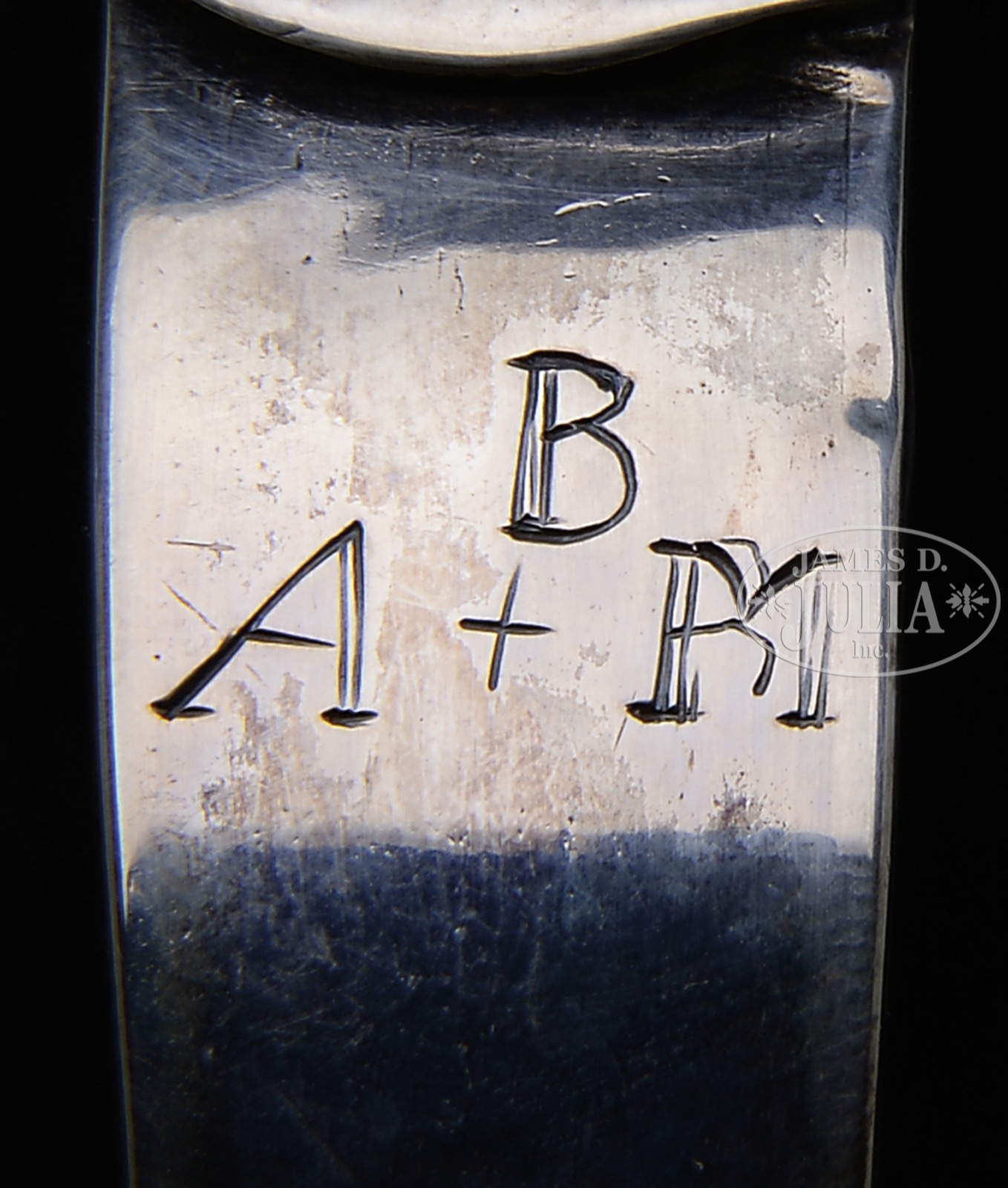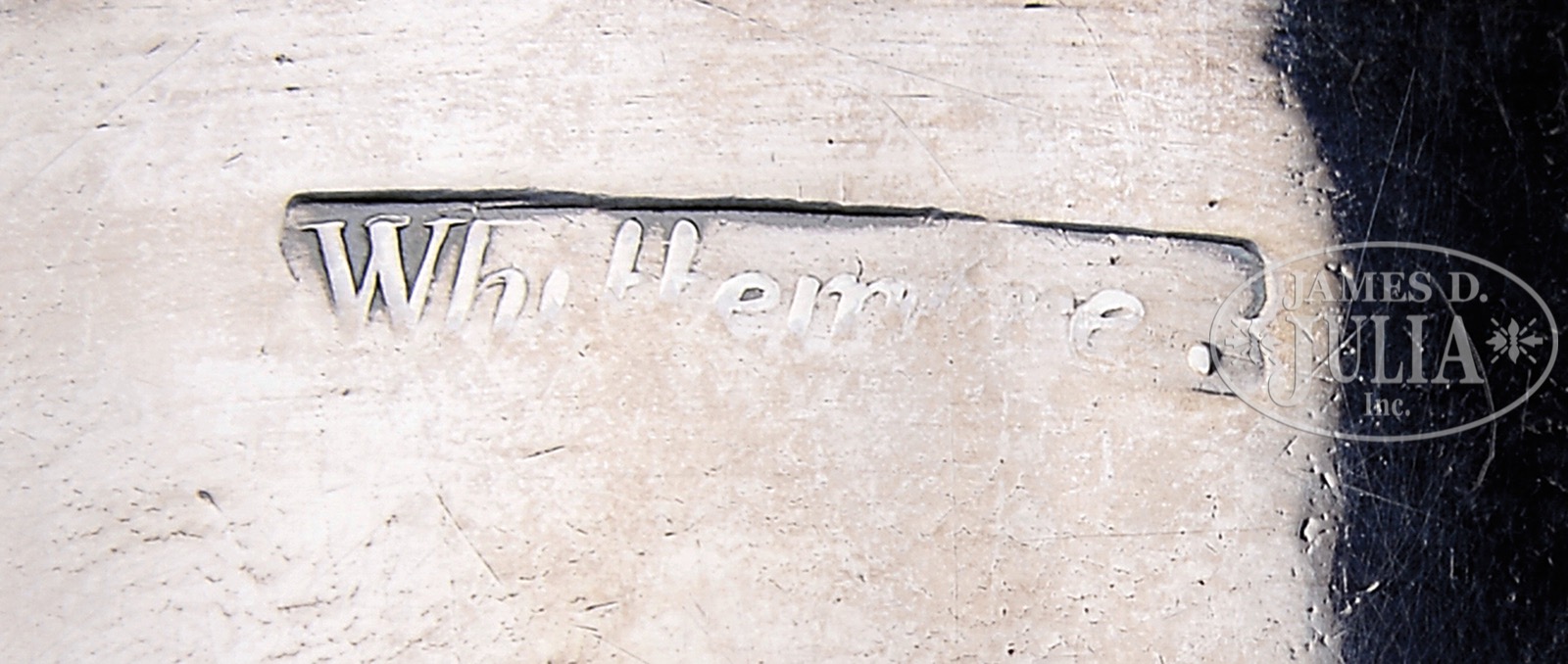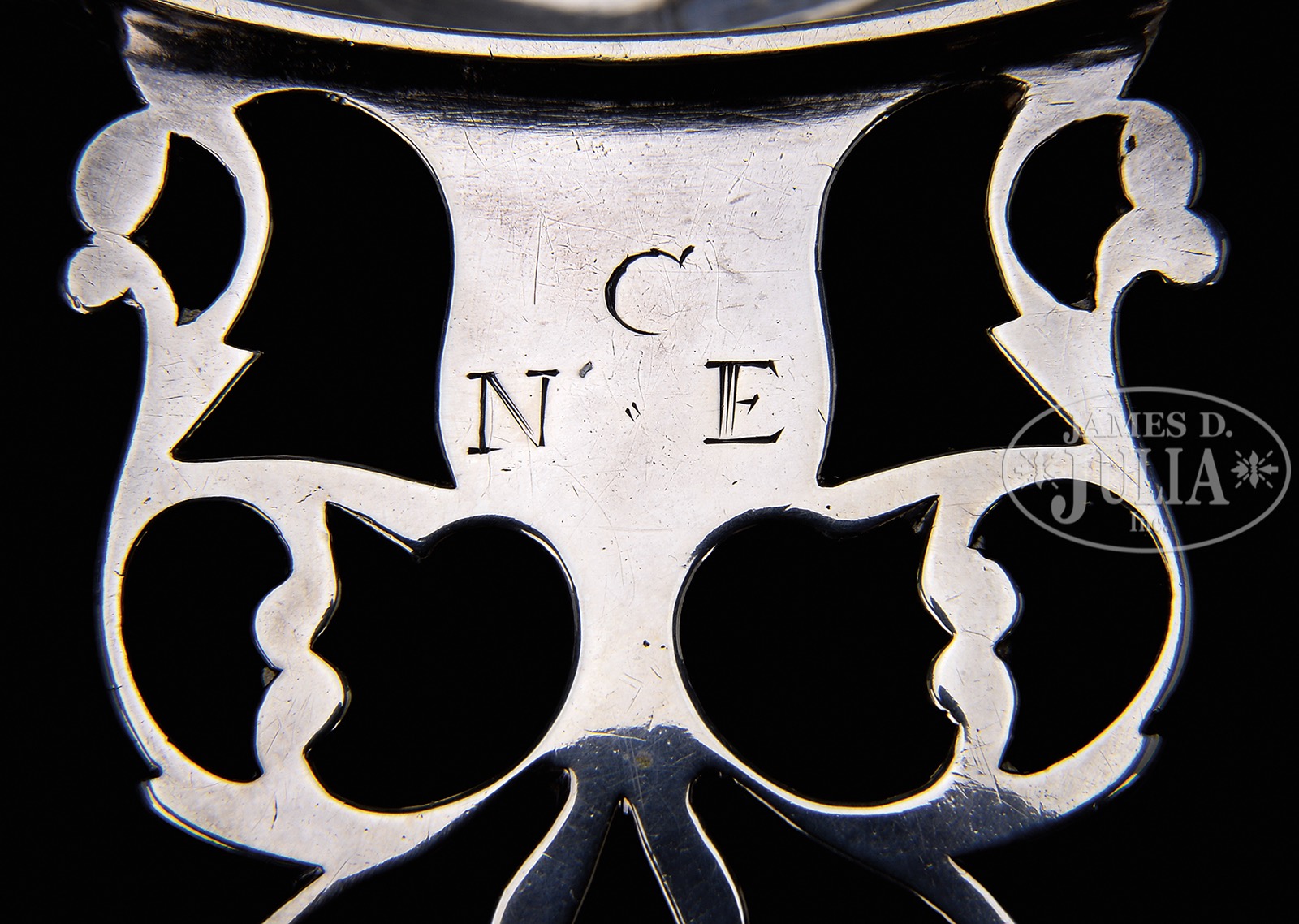 AMERICAN COIN SILVER PORRINGER BY JACOB HURD & TWO TANKARDS BY WILLIAM WHITTEMORE.Two 4-3/4″ handled tankards made by William Whittemore (1710-1770) of Portsmouth, NH. Each hallmarked below the top rim “Whittemore” and the handles monogrammed “B A+M”. Together with a porringer with openwork handle made by Jacob Hurd, 1702-1758, Boston, MA. The 5-1/2″ bowl having his hallmark on the side and inscribed “M Bulman” on the underside. The handle with initials “CNE”. WEIGHT: 26.5 troy oz. CONDITION: Tankards each with a very small fissure at the top rim, typical minor dents and wear to the surface. The porringer with old repair to bottom of bowl, small dents to side. 51159-4 (2,500-3,500) – Lot 2059