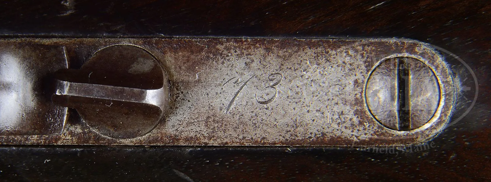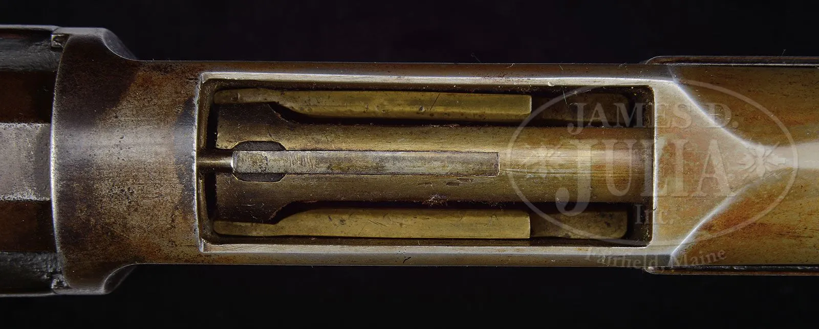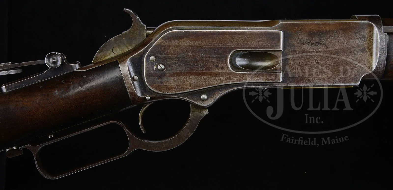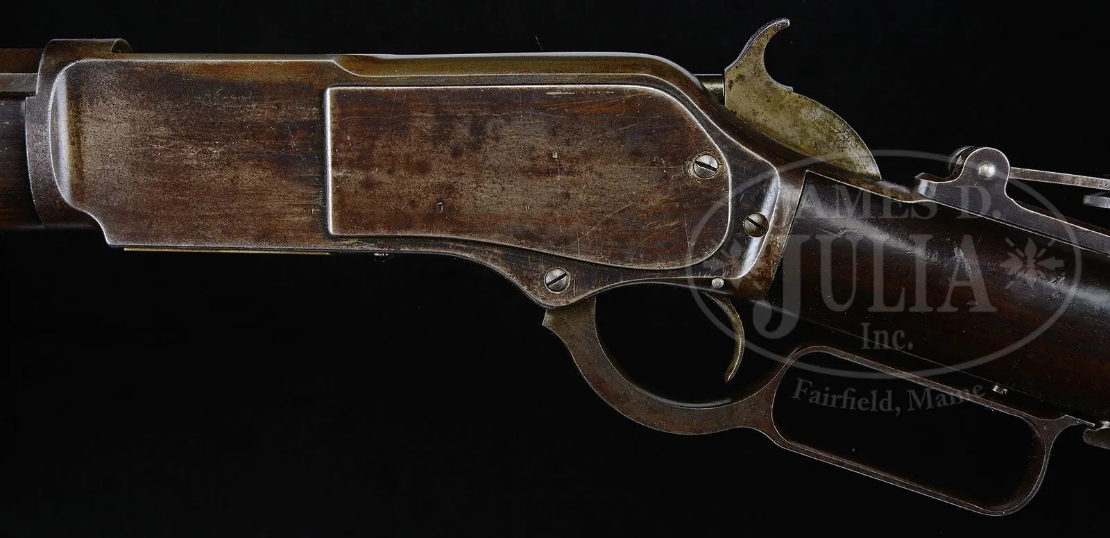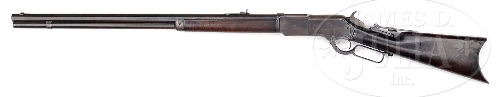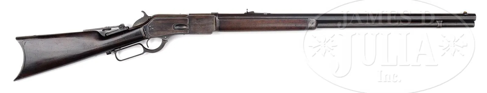 Please note: The correct serial number is 73 as stated in the title. RARE EARLY WINCHESTER MODEL 1876 OPEN TOP LEVER ACTION RIFLE SERIAL NUMBER 73.SN 27723. 45-75 Cal. WCF. Standard grade rifle with 28″ oct bbl, full magazine, brass bladed fixed front sight and semi bucktail ladder rear sight and 4-1/2″ mid-range Vernier tang sight. Receiver is open top style made without provision for a dust cover as first 3000 M-1876’s are. Mounted with uncheckered, straight grain, American walnut, straight stock and early style crescent buttplate with trap and thick heel. Open top rifles in both models 1876 and 1873 were produced for a very short period of time. It is reported that at that time there was a weakness in cartridge cases which caused them to rupture and if the dust cover was closed, would bulge the side plates. Apparently Winchester produced these rifles without dust covers which would allow escaping gases to blow upward instead of outward. After many complaints the ammunition problem was corrected and Winchester returned to supplying rifles with dust covers. Any rifle or carbine with an open top could be returned for a factory fitted dust cover. There is no factory letter found but according to Mr. Yearout’s notes this gun was shipped July 19, 1877 and that the gun is indeed 45-75 WCF though there is no external Cal. marking. Consecutive SN 74 open top is known. 281 and 306. PROVENANCE: Darwin Buehler, Salt Lake City, UT. Lewis Yearout 1976. Estate Collection of Lewis & Leyton Yearout. CONDITION: Very good to fine. Bbl retains 30-40% thinning bright blue; magazine tube retains traces of blue in protected areas with balance plum/gray patina; receiver retains about 10% thin orig blue, mostly on the sides with the top & bottom a mottled gray/plum patina with areas of pitting; top of frame is cleaned with a streaked gray/brown patina; lever has a gray/plum patina matching frame, hammer has muted case colors on side with balance a blue/gray; buttplate is brown/gray patina; stocks are sound and solid with hand rubbed patina and numerous small scratches and minor blemishes that can be seen in photos. 2-parts of an iron cleaning rod are found in buttstock. Mechanically sound with well discerned rifling though pitted. 4-53828 JS95 (6,000-10,000) – Lot 2060 Click here to view provenance