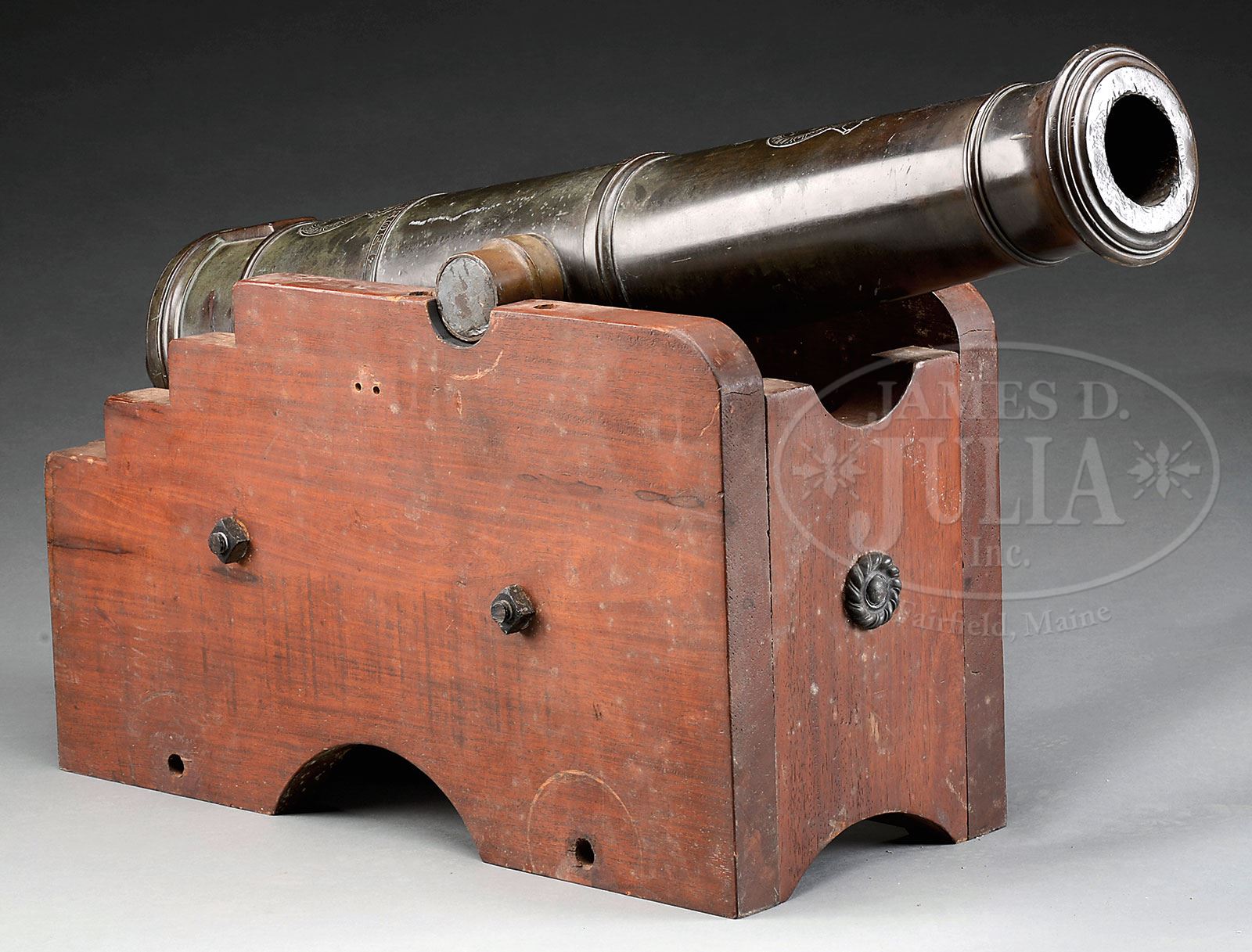FINE BRITISH WAR OF 1812 ERA BRONZE 3-LB MOUNTAIN GUN.This beautifully patinaed cannon measures 39″ overall with a 28″ bbl length and a bore of 2-3/4″. Cannon was made at the Royal Brass Foundry and dated 1808. A large cypher of King George III appears on 1st reinforce and the monogram of John Pitt, II Earl of Chatham, Master General of Ordnance is on the chase. John Pitt was the older brother to William Pitt the Younger who became Prime Minister under King George III during the Revolutionary War and his father William Pitt the 1st was well known before the Revolution and was also Prime Minister under King George II. Bbl is also proofed for British Military acceptance with broad arrow. Weight is marked in quarter weights on breech below cascabel “2.0.26” which translates to 250 lbs. This beautiful tube, which was obsolete in the 1890’s, was one of a pair given as a diplomatic gift to the Kenyan Government, mounted on later all steel screw-gun carriages and specially fitted trunnion caps were placed on this gun to fit. These trunnion caps could be removed if desired. This cannon has not been researched through the registers at the Tower of London, however, the proof registers do exist from 1779-1830 and based on the weight and registry no. “LVIII” cut into reinforce could provide gun’s proofing history. PROVENANCE: Joel Morrow; Springfield Arsenal, LLC Artillery Collection. CONDITION: Cannon is fine overall with crisp, easily discerned markings as can be seen in photos. The added trunnion covers are exactly fit, are pinned in placed & do not detract from overall esthetics. Cannon is mounted on a wooden stepped carriage of later vintage which measures about 30″ x 18″. 4-54217 (15,000-20,000) – Lot 2061