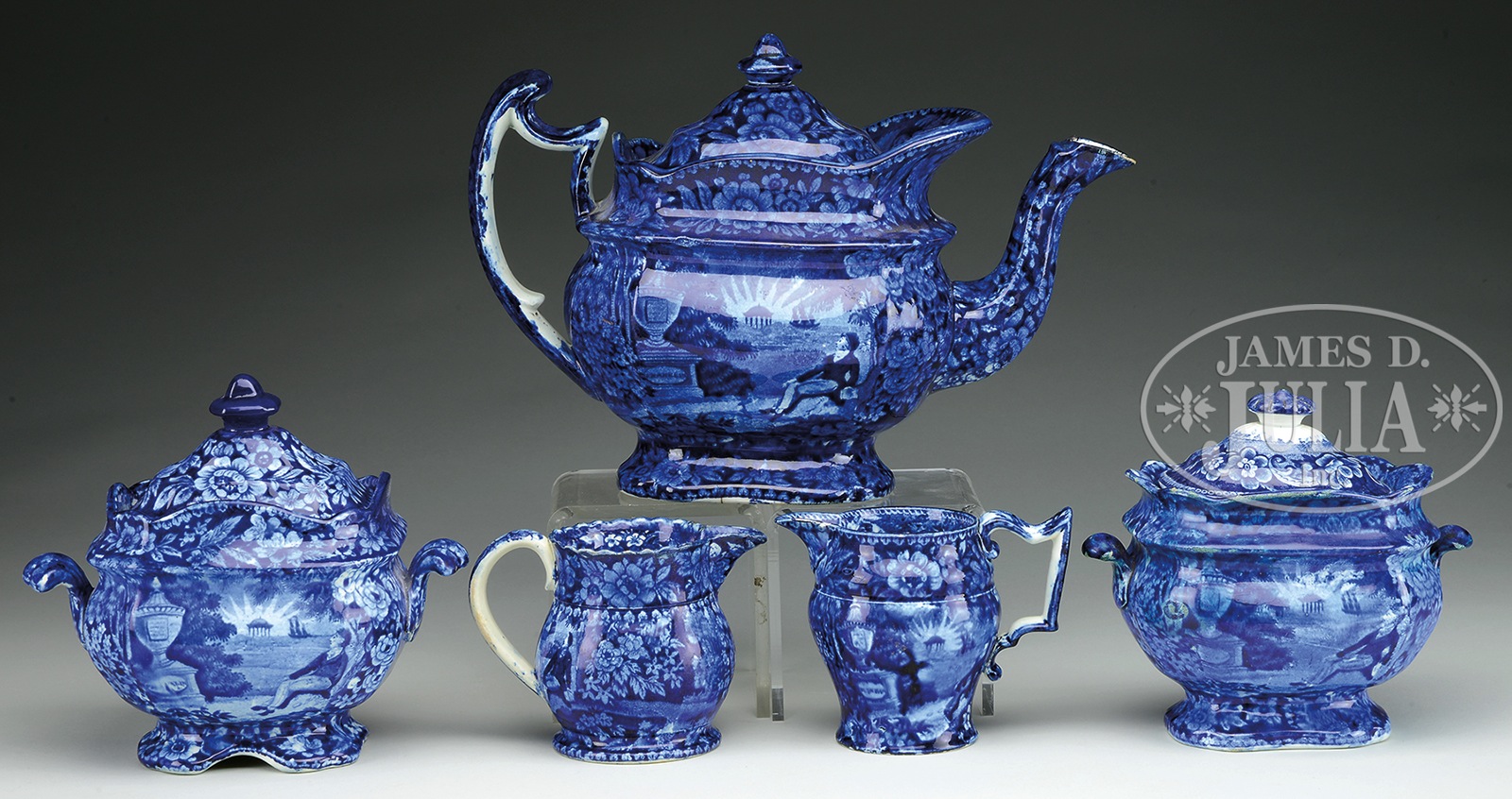 GROUP OF FIVE DARK BLUE STAFFORDSHIRE TEAWARES IN THE “LAFAYETTE AT FRANKLINS TOMB” PATTERN.1) 19th century. Large teapot with cover. 2) Circa 19th century. Two handled sugar bowl with cover. 3) Two handled sugar bowl with impressed mark. 4) Creamer with ruffled edge. 5) Tall creamer. SIZE: 1) 8″ h. 2) 6″ h. 3) 6-1/4″ h. 4) 4″ h. 5) 4-1/4″ h. PROVENANCE: From a Maine collection CONDITION: 1) Significant crack radiating from one collar around the base to the other collar, with another hairline in base and a small hairline inside, restoration and chip to spout, lid with small and larger chips, otherwise good. 2) Mismatched cover, considerable old restoration to body of sugar bowl, chip to interior of lip. 3) Restored finial, restored cover lip, restoration around lip above collar, some restoration to body. 4) Repaired chips around top, repaired spout, overall wear. 5) Chip on base, chip on spout, and wear. 9-94553 (800-1,200) – Lot 2062