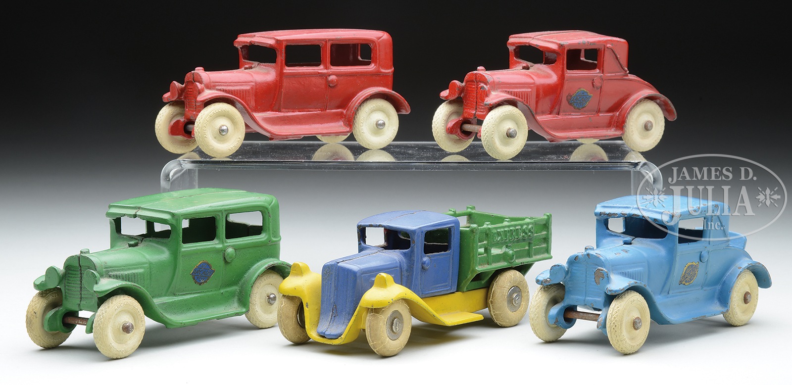 Please Note: The catalog states the truck is by AC Williams which is incorrect. It is actually by Kilgore. 4 ARCADE AUTOS AND AC WILLIAMS TRUCK.The following five toys came from an elderly gentleman who has had them for decades and for the most part, they are in virtually unplayed with condition. Three of the four Arcade cars have original decals and all four have the typical signature Arcade rubber tires. These four cars would be ideal on the Arcade car carrier if you have one without the vehicles. Overall they are very fine+ with slightly more chipping to the red and blue roadsters. The take-apart Williams truck is most unusual, not only in the fact that they employed three different colors, but the vehicle itself is seldom found. Rubber tires are intact and have some alligatoring, but original. This truck is in remarkable original paint condition. SIZE: Varies from 5″ to 5-3/4″ l. CONDITION: As stated above. 49014-2 (750-1,250) – Lot 2062 Auction: Advertising, Toy & Doll - Spring 2015 Please Note: All prices include the hammer price plus the buyer’s premium, which is paid by the buyer as part of the purchase price. The prices noted here after the auction are considered unofficial and do not become official until after the 46th day. |