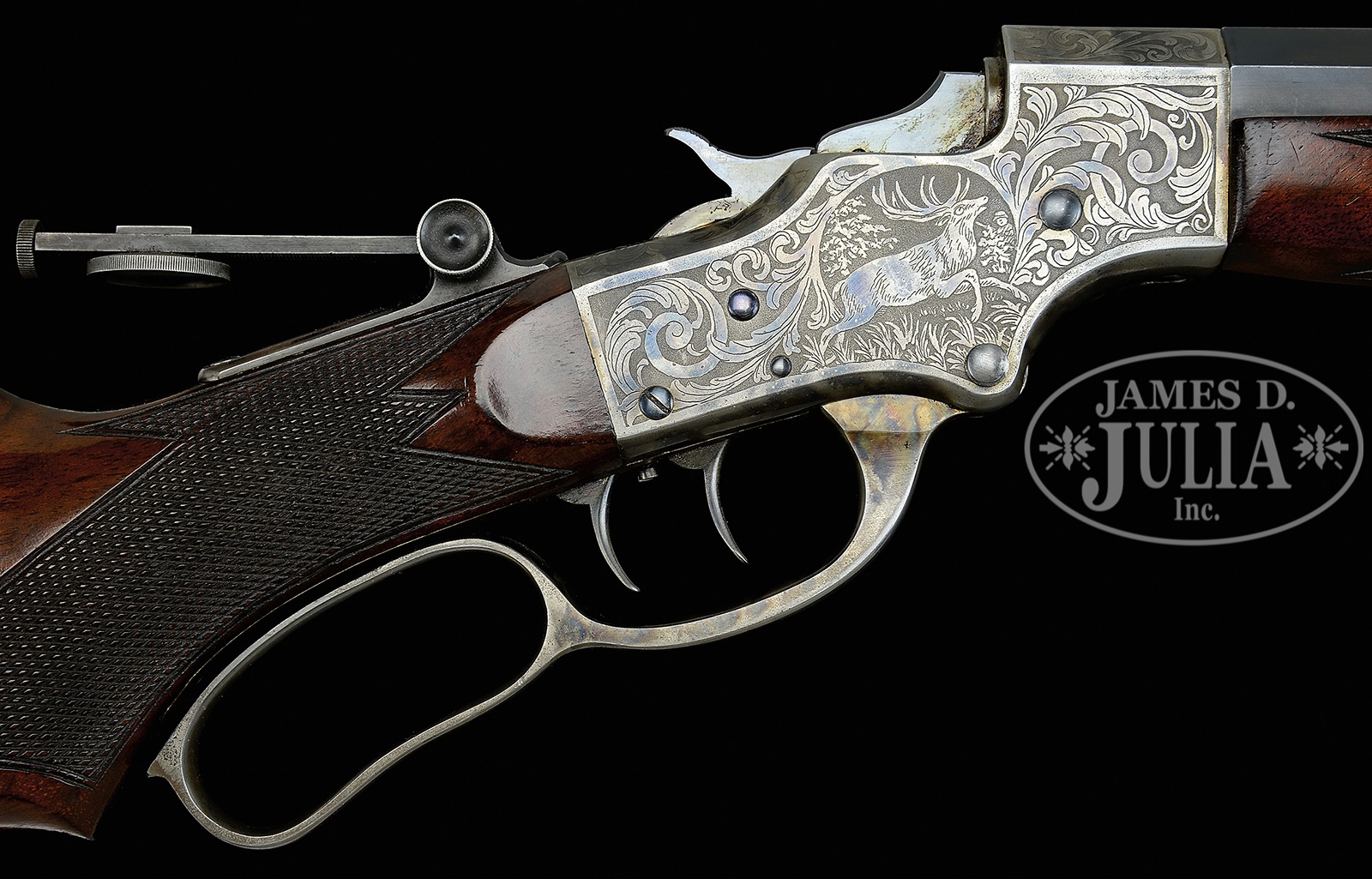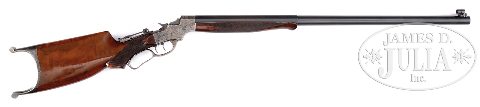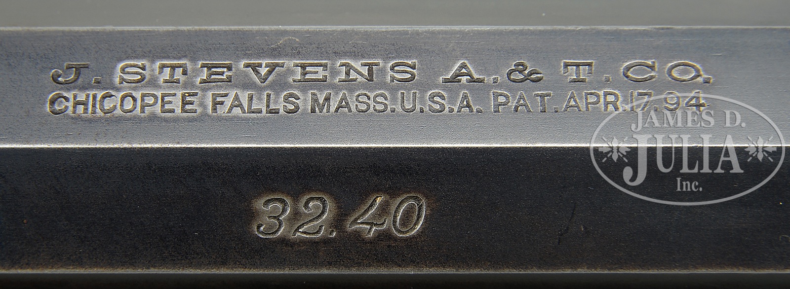 SCARCE STEVENS IDEAL “SCHUETZEN JUNIOR” MODEL 52 SINGLE SHOT TARGET RIFLE.SN 10097. Cal. 32-40. Fine target rifle with 30″ about #4 weight oct to rnd bbl, windgauge globe front sight & no provision for a rear sight. Top tang has an extra hole and is mounted with a Winchester Model ’73 thin base vernier tang sight with 3″ staff. Receiver has dbl-set triggers and top flat of the bbl has the Stevens 2-line address with Cal. marking on top left flat. Mounted with very nicely figured American walnut with checkered, semi-Schnable tip forearm and serpentine grip buttstock with cheekpiece and heavy Schuetzen buttplate with medium ball-tip prongs. Receiver is beautifully etch-engraved with the vignette of a bird dog on the left side and a leaping stag on the right side, all surrounded by intertwined foliate arabesque patterns. Matching patterns extend over the top 3 flats and top rear of the receiver. It also has full loop finger lever. SN was observed in the usual place on the lower tang, bottom of the bbl with last 3 digits of matching number on rear face of forearm, in white chalk or grease pencil on rear face of buttstock & inside the buttplate. Stevens Target rifles were extremely popular around the turn of the 20th Century, winning many awards & trophies for their owners. They rarely are found today in completely orig configuration as most of the shooters of that day altered their rifles to suit their shooting style and requirements. CONDITION: Fine to very fine, all matching. Bbl retains 97-98% fine rust blue that may be an old restoration. Receiver retains about 50% faded case colors, stronger in sheltered areas, bright on sides of the lever, faded on outer faces. Buttplate retains about 80% strong orig case colors. Breech block and hammer retain most of their orig blue. Stock has a fine hairline on left side at the buttplate, otherwise the wood is sound with the buttstock retaining about 98% bright orig varnish with a couple of small bruises in the checkering on the wrist. Forearm retains about 70% orig varnish showing moderate wear on the checkering. Mechanics are crisp, bright shiny bore. 50246-1 JR204 (5,500-8,500) – Lot 2063