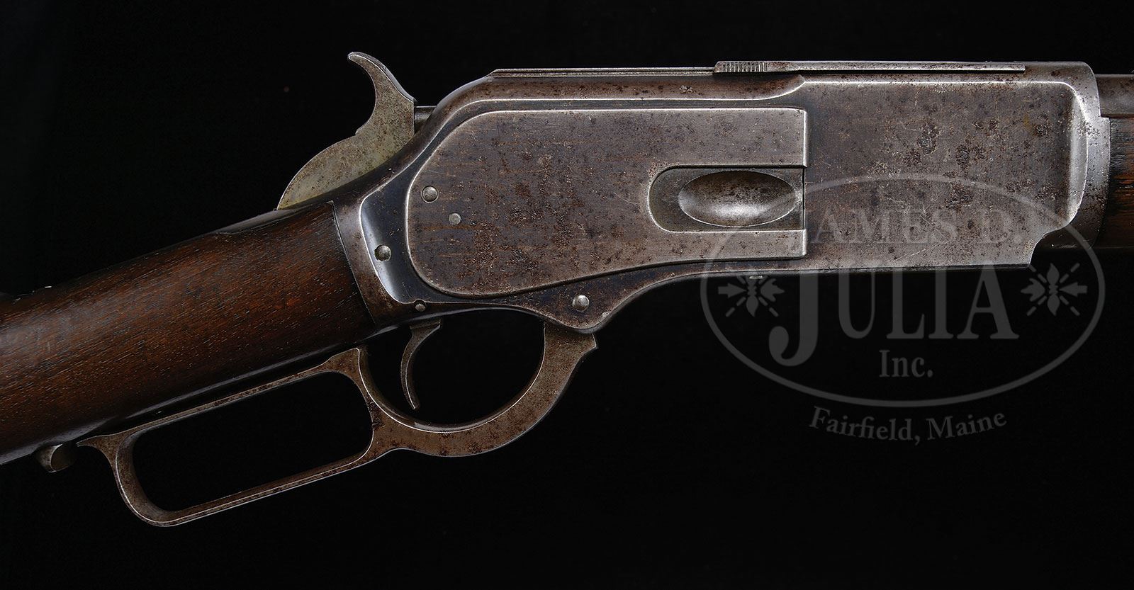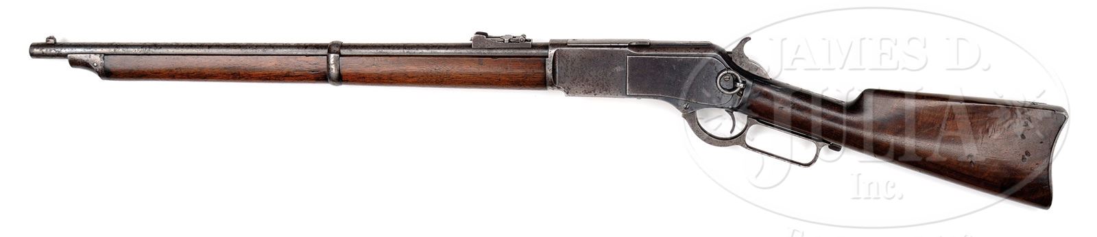RARE WINCHESTER MODEL 1876 SADDLE RING CARBINE SHIPPED TO THE FAMOUS NORTH WEST MOUNTIES IN 1885.SN 44465. 45-75 Cal. Standard grade carbine with 22″ bbl, barleycorn fixed front sight and carbine ladder rear sight. Receiver is 3rd type with milled rail and 3rd type dust cover. It has a stud and carbine ring in the left side. Mounted with uncheckered straight grain American walnut with full length forearm, steel nose cap and single band. Buttstock has straight grip and carbine buttplate. This carbine was purchased by the Canadian Northwest Mounted Police per factory letter and shipped as one of 300 guns shipped April 8, 1885. This was a very popular carbine in its day, being the first carbine to handle the large bore cartridges. The Northwest Mounties saw very hard service and their arms are rarely found in fine condition today. There are several letters concerning this gun which state this gun was found in an old trapper’s cabin in what may have originally been the jail house for Trout Lake City, British Columbia. Regardless this is a wonderful “as found” 76 carbine that saw service in the Canadian Northwest. PROVENANCE: Leo Goodwin, Revelstoke, B.C. Mark Nordland, Powell, WY 1984. Lewis Yearout 2000. Estate Collection of Lewis & Leyton Yearout. CONDITION: Very good to fine overall. Gun retains traces of finish on frame and bbl. Bbl address markings and cal markings are crisp and well defined and discerned. Stocks are well fit with typical small blemishes and several large dents as can be seen in photographs. Hand worn patina. Mechanically gun functions well with good discernible rifling in bore though pitted. 4-53840 JS107 (5,000-7,000) – Lot 2065 Click here to view provenance