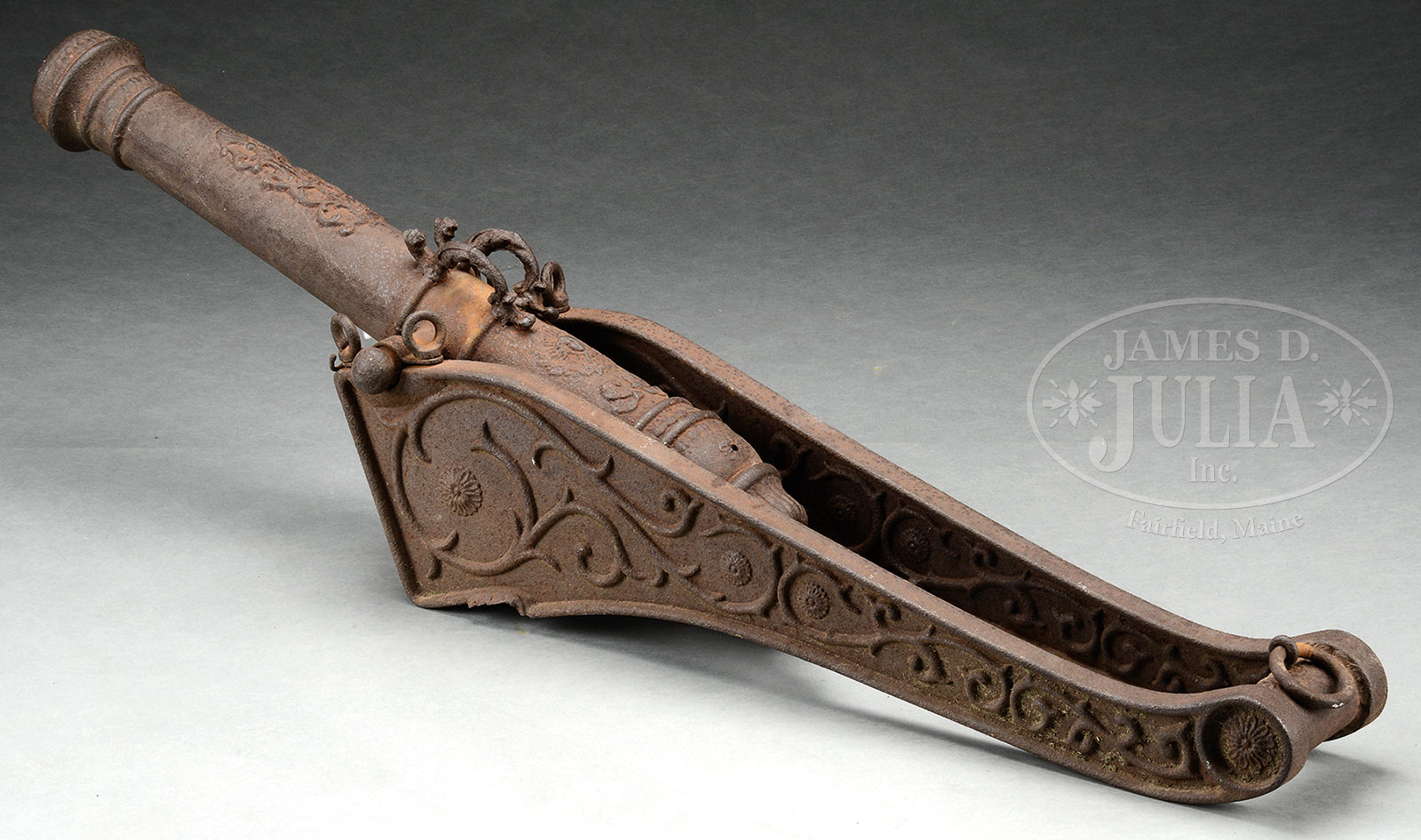 VICTORIAN STYLE CANNON ON CARRIAGE.80lbs, 32″ iron bbl, 1-3/4″ bore raised relief decoration and dolphin handles mounted on 34″ x 10″ iron carriage. Carriage has similar raised relief decoration, including lion’s head on front. Cannon was not made to shoot projectiles, but vent is bored though as such so that it could’ve been used as a noise maker or salute gun. SIZE: 51″ x 10″ overall. CONDITION: Good overall with iron patina, pitted overall. No discernible makers marking. 52222-23 (600-800) – Lot 2065