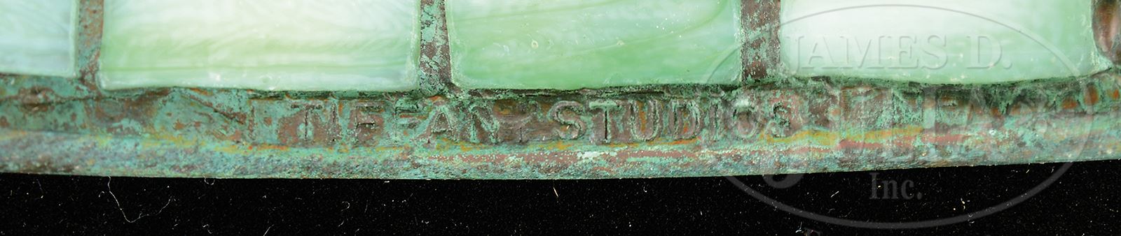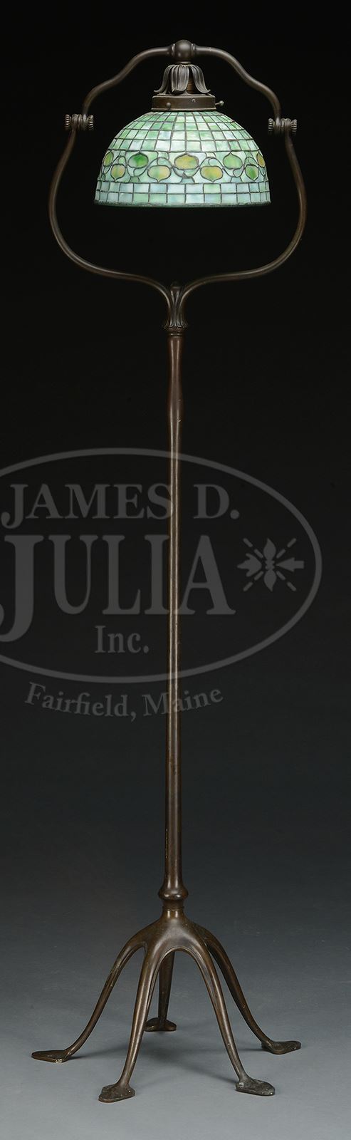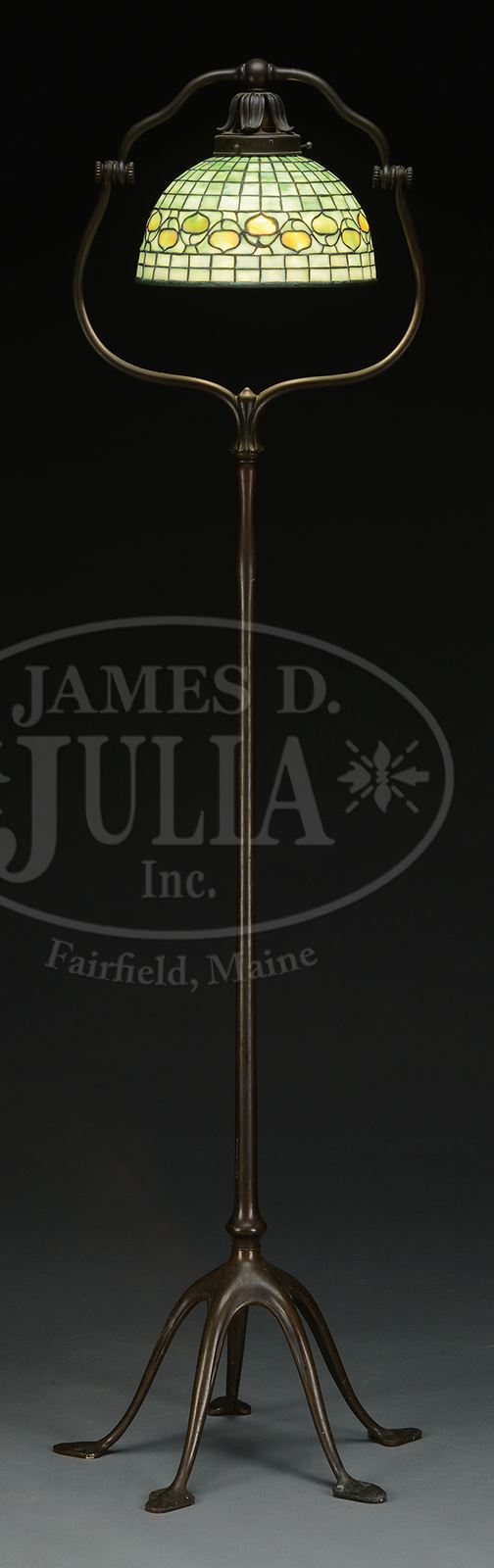 TIFFANY STUDIOS ACORN FLOOR LAMP.Tiffany Studios floor lamp has five legs with lily pad feet supporting tall slender stem and double harp. The base is finished in medium brown patina and signed on the underside “Tiffany Studios New York 423H”. Base houses a Tiffany Studios acorn shade which is decorated with a band of mottled amber and green acorns against a shaded green and cream geometric background. Shade is signed on the inside lip “Tiffany Studios New York 1400-17”. SIZE: Shade is 10″ dia. Lamp is 58″ t. CONDITION: Shade has a few tight hairlines, otherwise very good to excellent. 50398-3 (12,000-15,000) – Lot 2067