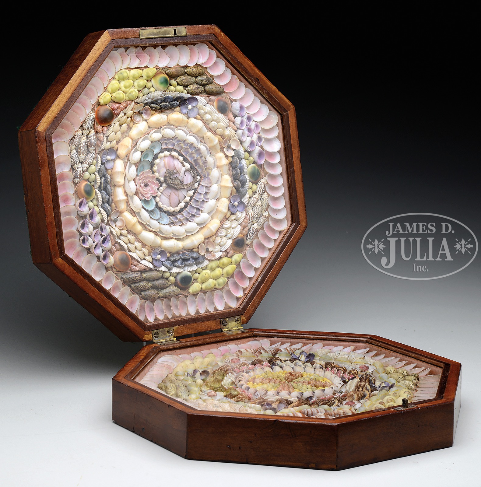 LARGE DOUBLE SAILOR’S VALENTINE.19th/20th Century. The eight sided wood case hinged and when opened reveals two very nice displays of colorful shells. One side includes a center heart & flower with seahorse. The other a six-petal flower. A fine mahogany veneered case with felt bottom and lock, key not present. SIZE: 12-1/2″ dia. CONDITION: Very good. 51376-43 (3,000-5,000) – Lot 2067
