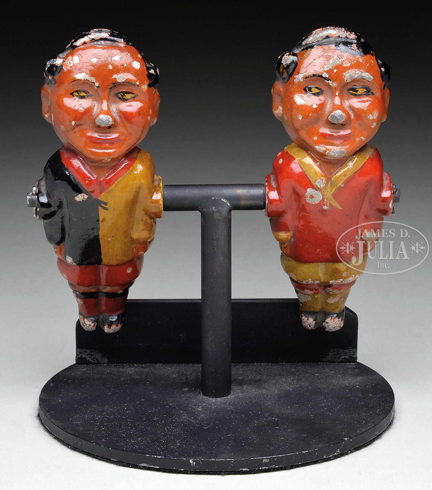 CAST CARNIVAL TARGET FIGURES.Two cast aluminum hand painted target figures. Shooter would hit top side of figure to flip over. Polychrome type finish with typical chipping from use. Base is not original. SIZE: 6-1/2″ t overall. Figures are 5-1/2″ t. CONDITION: Working pivot base with original paint on figures remaining good. 49103-24 (600-900) – Lot 2067A Auction: Advertising, Toy & Doll - Spring 2015 Please Note: All prices include the hammer price plus the buyer’s premium, which is paid by the buyer as part of the purchase price. The prices noted here after the auction are considered unofficial and do not become official until after the 46th day. |
