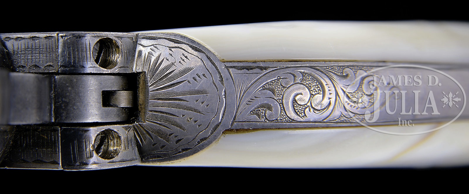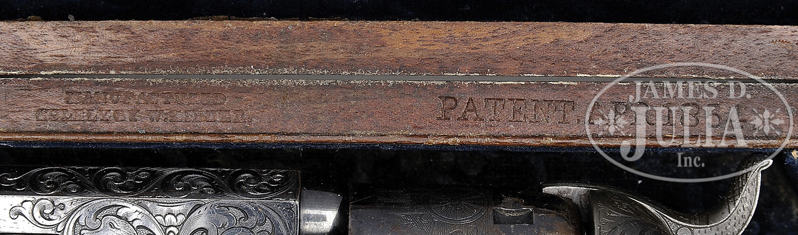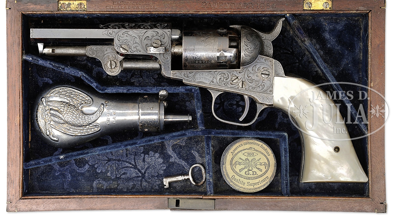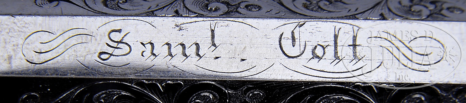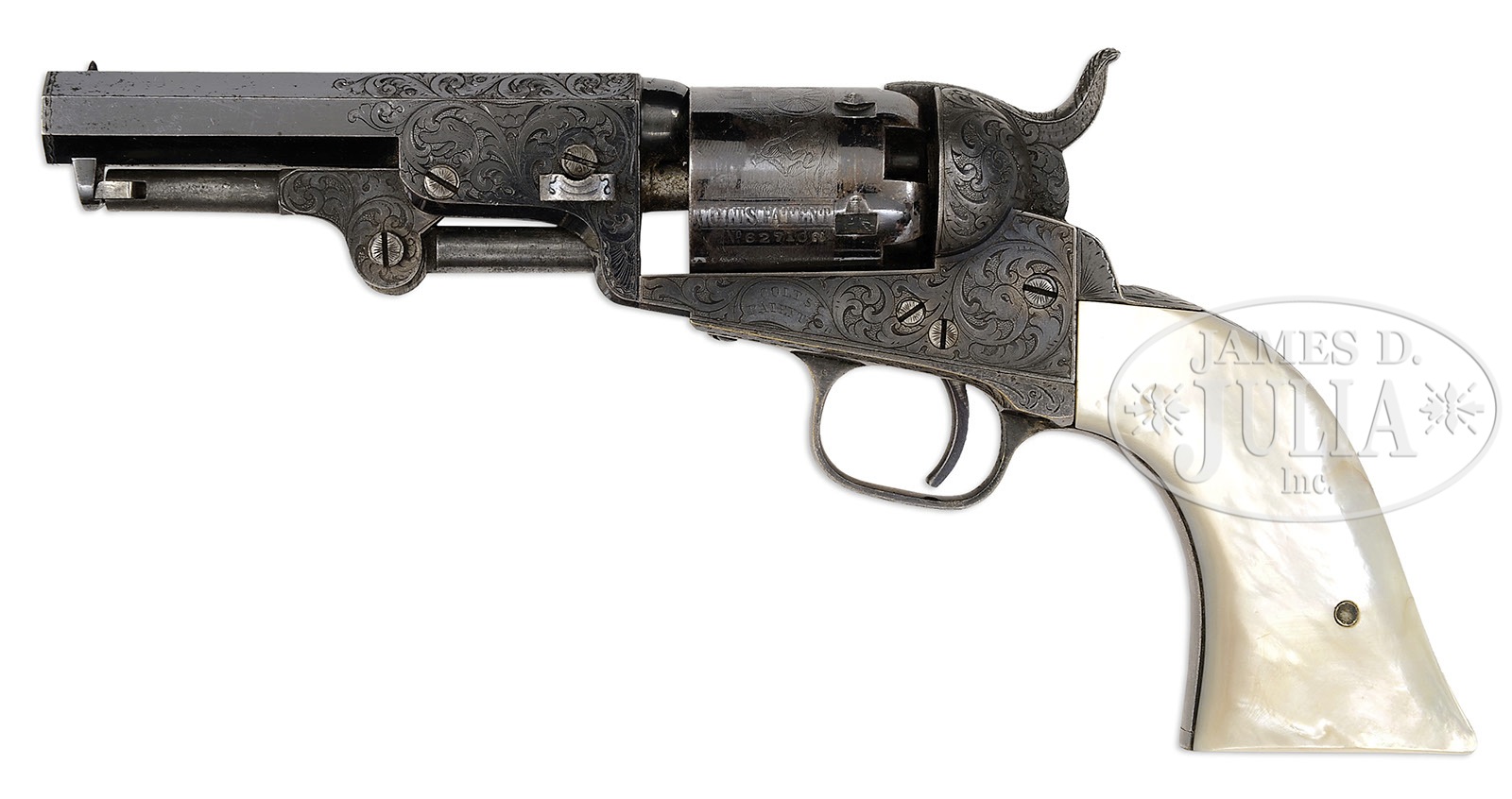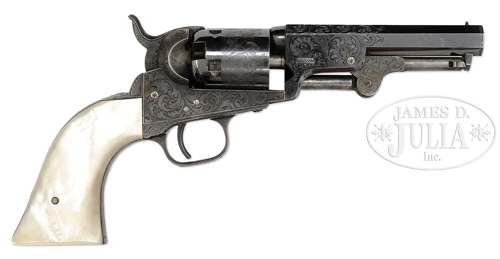 RARE CASED ENGRAVED COLT MODEL 1849 POCKET PERCUSSION REVOLVER.SN 62710. Cal 31. Blue & color case hardened with 4″ oct bbl, brass pin front sight & engraved address “Saml. Colt”. Left side of frame is engraved “COLT’S PATENT” in a pillow shape. Mounted with distributor supplied 1-pc pearl grip constructed of 2 slabs of pearl attached to a center wooden spacer that has a pin through both sides. Cylinder is usual 5 shots with stagecoach hold up scene roll marking. Revolver is engraved by Gustave Young in his deluxe full coverage patterns consisting of foliate arabesque scrolls, one of which terminates in his mythical bird’s head on the frame. Matching patterns extend over the bbl lug with another mythical figure incorporated into one of the scrolls. Rammer pivot is engraved to match. Top of the back strap is engraved in his typical fan pattern with foliate arabesque patterns down the back strap, on the buttstrap and trigger guard. Screw heads are all engraved as are the ends of the wedge. Hammer is also engraved in Mr. Young’s deluxe patterns with a wolf’s head on both sides of the nose, foliate arabesque patterns on the shank and fish scale patterns on the top edge & sides of the spur. Spur is hand checkered. Accompanied by a patterned blue velvet lined Kidder case with Kidder’s markings on the top rear edge of the bottom. Corners are brass reinforced. Bottom inside is partitioned for the revolver, an early “COLTS PATENT” double sided eagle case with Dixon spout, a small lacquered tin of Goldmark’s caps and a functioning key. This revolver was produced in about 1853 and likely was a presentation for someone of reasonably high position. These early pocket models are rarely found with any orig finish given that they usually saw hard service on the American frontier and later throughout the Civil War. PROVENANCE: Norm Flayderman Estate Collection. CONDITION: Extremely fine, all matching except wedge which is numbered “2717” but is engraved so undoubtedly has been with this revolver its entire existence. Bbl retains about 98% glossy orig blue with faint sharp edge wear and some very minor spots of flaking. Rammer pivot & handle retain dark case colors. Frame & hammer retain about 97-98% strong orig case colors that are typically muted for this period of production. Cylinder retains 93-95% glossy orig blue and shows about 99% crisp stagecoach hold up scene roll marking. All 5 safety pins are prominent & serviceable. Trigger guard & backstrap retain virtually all of their orig silver. Grips are fine with good fire and light iridescent colors. Case has a small grain check in the lid and a stress crack vertically through the lock escutcheon, which is missing. Interior is moderately faded & soiled with all partitions intact. One partition has an old repair. Flask has been replated. 4-51136 (20,000-30,000) – Lot 2068