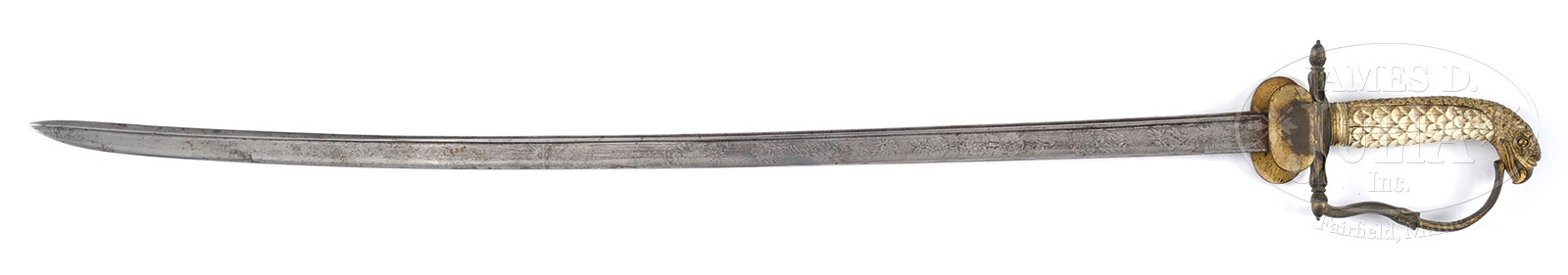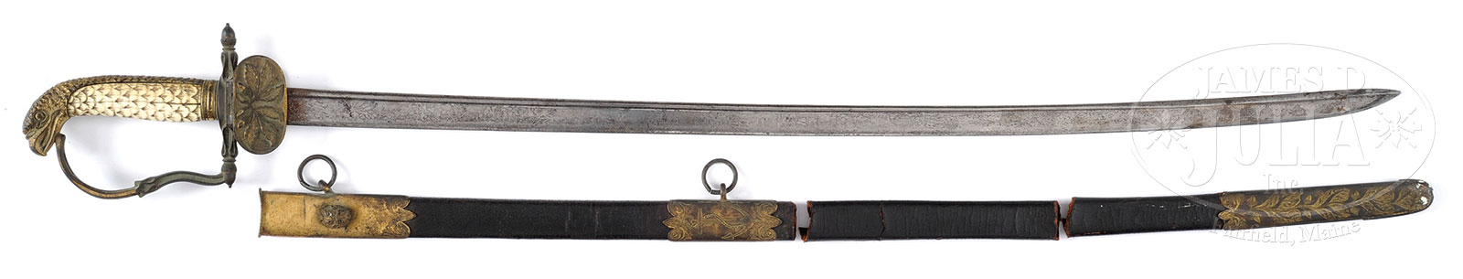 RARE INSCRIBED MODEL 1841 REGULATION US NAVAL OFFICER’S SWORD OF LT. HENRY T. WINGATE.Fine ivory gripped eagle-head sword inscribed on rear languette “H. TINGEY WINGATE / USN”. Henry T. Wingate was born in Charlestown, MA in 1817 and died in 1854 and is buried in Mt. Auburn Cemetery in Cambridge, MA. Wingate is listed as a mid-shipman on the USS Potomac in 1840. Accompanying this sword are five pieces of silver flatware, all with his last name “WINGATE”. Three of the pieces are coin and are marked “LINCOLN & REED” (Boston). SIZE: Sword & scabbard: 33″ overall. PROVENANCE: Original contents from the estate of Louise Alida Livingston, Oyster Bay, L.I., N.Y. Removed from the family home, Greenport L. I., N.Y. Special Note: This item(s) contains plant or animal properties that may be covered by the Endangered Species Act (ESA). Please read the Conditions of Sale, section 15, for more information regarding the Endangered Species Act, and your responsibilities as a buyer. CONDITION: Sword is very good overall, 28″ blade is overall grey with scattered areas of staining and pitting. Patriotic naval etched motifs are discernible, though weak. Rusted at ricasso and no discernible makers mark. Original scabbard which accompanies sword is broken in three pieces, but all three engraved mounts are intact and retain much of their gold plating with overall matching chocolate/green patina to brass hilt. Carved ivory grip is complete with several hairlines. All in all, an honest “as found” scarce American naval sword. Flatware is very good overall. 51941-26 (800-1,200) ESA – Lot 2068
