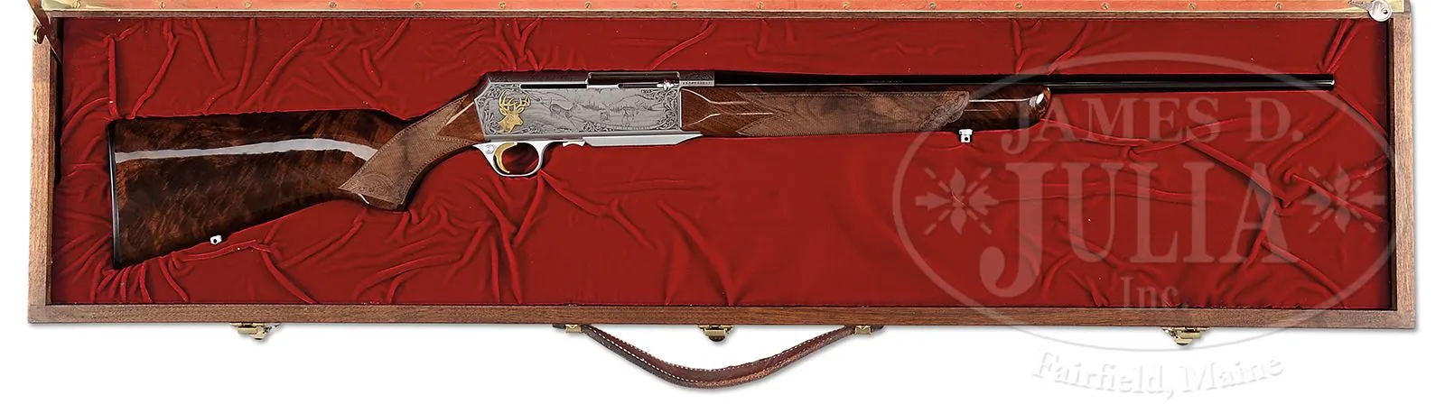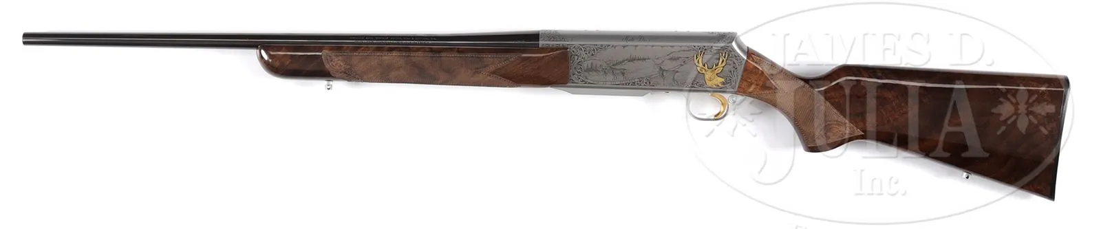 *BROWNING BAR “NORTH AMERICAN DEER RIFLE” NUMBER 592 OF 600, ENGRAVED BY J. H. DIET WITH BOX AND DISPLAY CASE.SN 437PY00592. Cal. 30-06. 22″ Round bbl marked with Browning Morgan Utah and Montreal addresses, and “MADE IN BELGIUM BY FABRIQUE NATIONALE HERSTAL” on left, and with “BAR”, caliber, and “BROWNING PATENTS” on right. Coin finished action with hinged magazine and gold plated trigger has sides engraved with well cut semi-relief large open shaded scroll with finely beaded background surrounding nicely detailed game scenes of deer in their normal habitats, along with semi-relief gold inlaid portraits of subject deer; mule deer on left and white tail deer on right. “ONE OF SIX HUNDRED” is in banner on left. “592 OF 600” is on right. Both scenes are signed “J. H. Diet”. Top of action is also scroll engraved and with “Mule Deer” on left and “White tail Deer” on right. Fine crotch figured claro walnut square knob pistol grip buttstock measures 13-3/4″ over Browning buttplate. Closely spaced checkering with beaded borders and relief carved acanthus at bottom is at grip. Matching large forend is held by combination sling stud and screw. Weight: 7 lbs 11 oz. LOP: 13-3/4″. Rifle is accompanied by its orig factory black and gold box, with correct end label, as well as factory supplied walnut display case lined in red velvet, containing key. CONDITION: Excellent, essentially as new, with only the faintest of handling marks in wood and metal finishes. Carving and checkering very slightly darkened. Gold of trigger is excellent. Box is excellent with some chipping and tape. Display case has some handling marks on exterior, interior with compressions from rifle. 49033-8 MGM151 (5,500-8,000) – Lot 2069