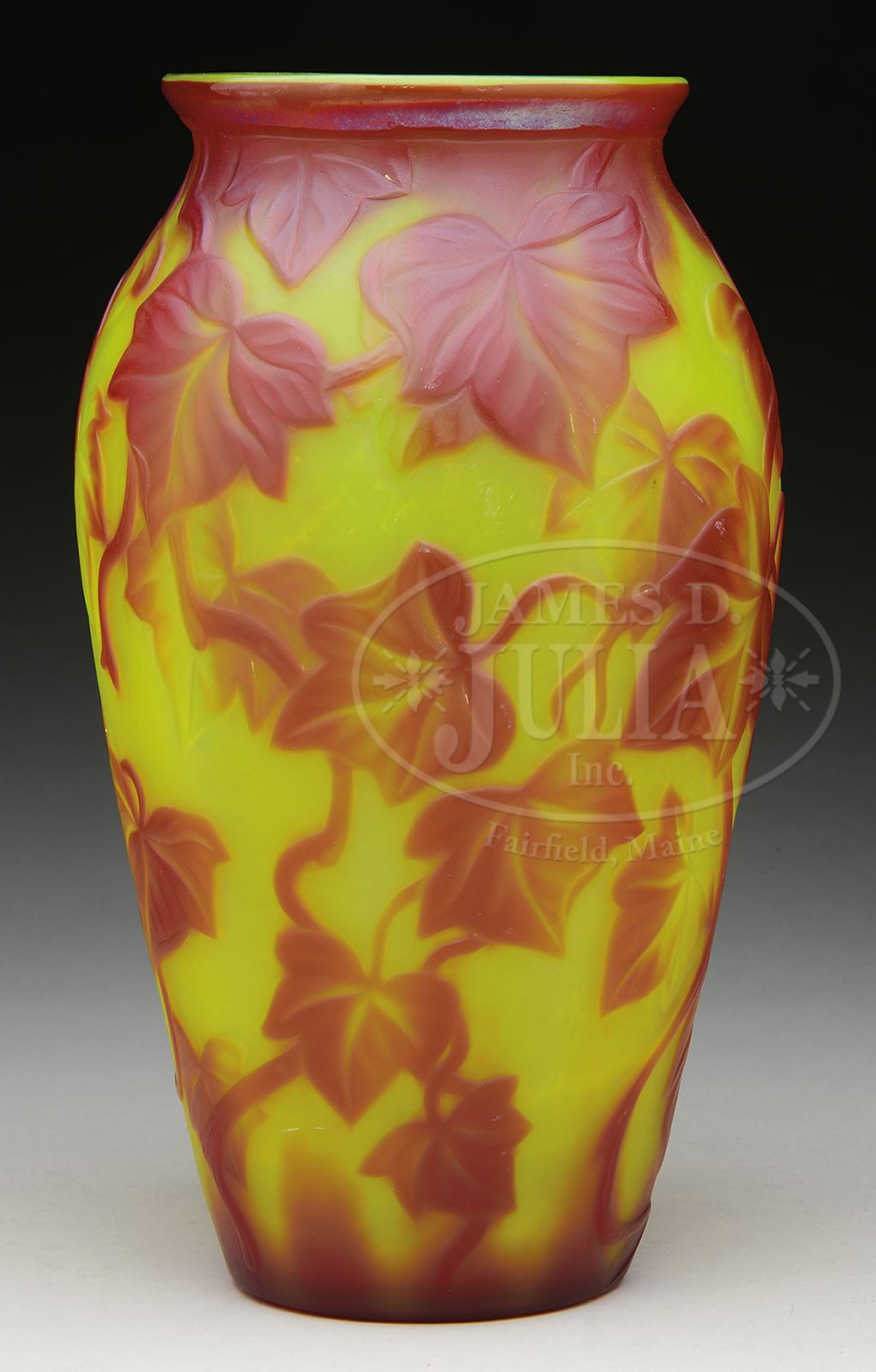 TIFFANY CAMEO GLASS VASE.Decorated with red wheel carved cameo ivy leaves and vines surrounding body against yellow background. Base is finished with button pontil and is signed on underside with engraved signature “L.C. Tiffany-Favrile 9913A”. SIZE: 10-1/4″ t. CONDITION: Very good to excellent. 50429-68 (15,000-20,000) – Lot 2069