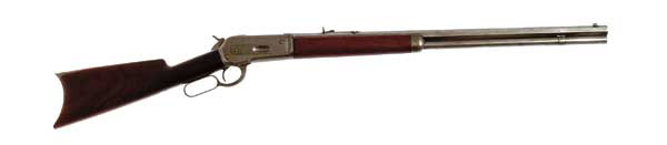 WINCHESTER MODEL 1886 LEVER ACTION RIFLE. Cal. 45-90. Very early standard grade rifle with 26″ oct. bbl, full magazine, uncheckered wood with straight stock and crescent steel buttplate. SN 2092. CONDITION: Good to very good. The metal cleaned bright and the wood is sound and lightly sanded with an old refinish. Bbl has a wrench mark over the chamber area. Strong, frosty bore. 4-46522 JR18 (1,500-2,500)