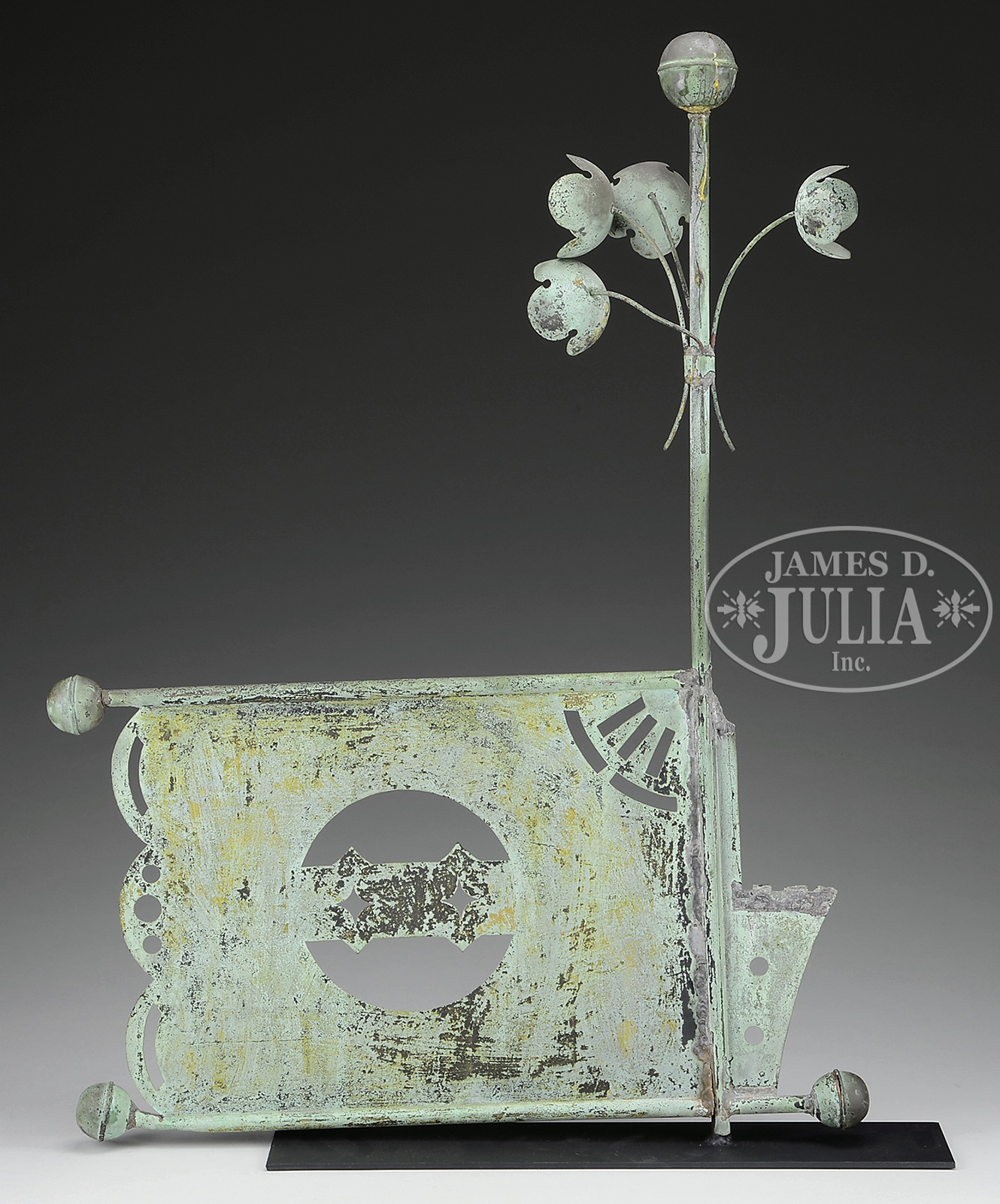 COPPER BANNER WEATHERVANE BY FISKE.Cutout sheet copper weathervane with ball finials and with floral spray at top. Having very good verdigris surface. Attributed to J.W. Fiske, New York. Offered without a museum stand. SIZE: 27″ h x 22″ l. CONDITION: Solder repair. Possible loss at front edge. Upper ball detached. 9-93562 (600-900) – Lot 2070