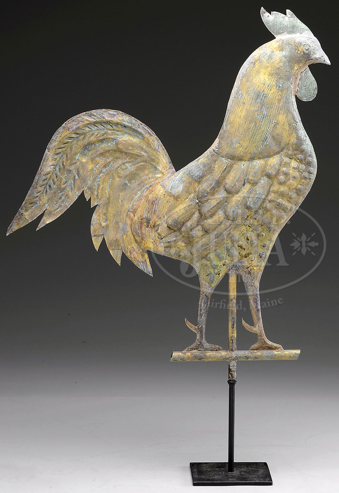 FULL FIGURED ROOSTER WEATHERVANE. Late 19th century, New England. The copper and zinc weathervane in flattened three dimensional form with good gilt and verdigris surface, now with museum mount. SIZE: 23″ T x 21″ L. CONDITION: With minor seam separations, otherwise very good and untouched. 9-91568 (4,500-6,500)
