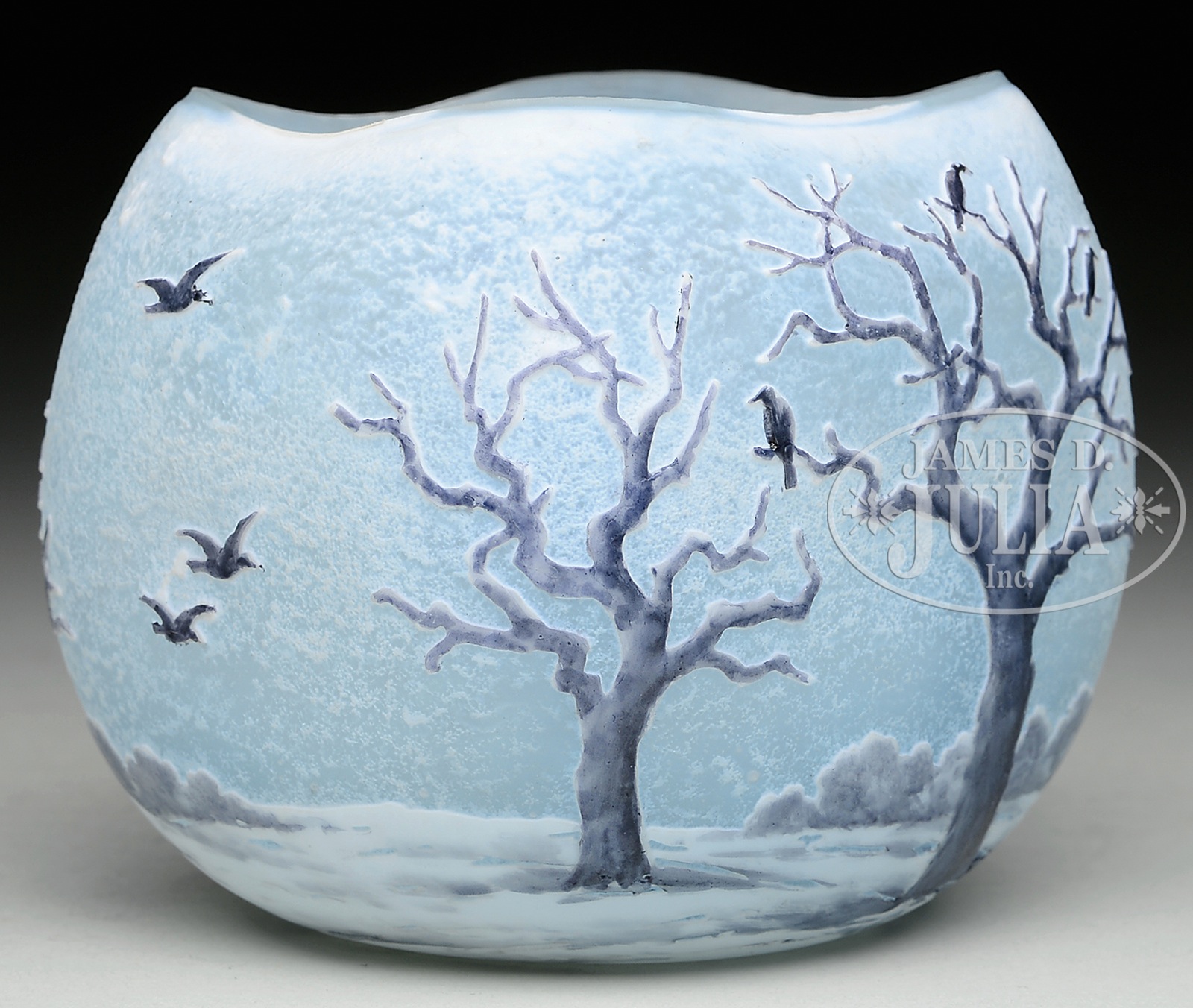 DAUM BLACKBIRD VASE.Daum cameo and enameled vase has cameo decoration of barren trees rising from snowy ground against a light blue frosted background sky with snow in the air. Trees are enameled in mottled gray and are further decorated with four enameled blackbirds perched on tree limbs with three more blackbirds in flight. Vase is signed on the underside in black enamel “Daum Nancy” with the Cross of Lorraine. SIZE: 2-3/4″ t. CONDITION: Very good to excellent. 5-69029 (6,000-8,000) – Lot 2071