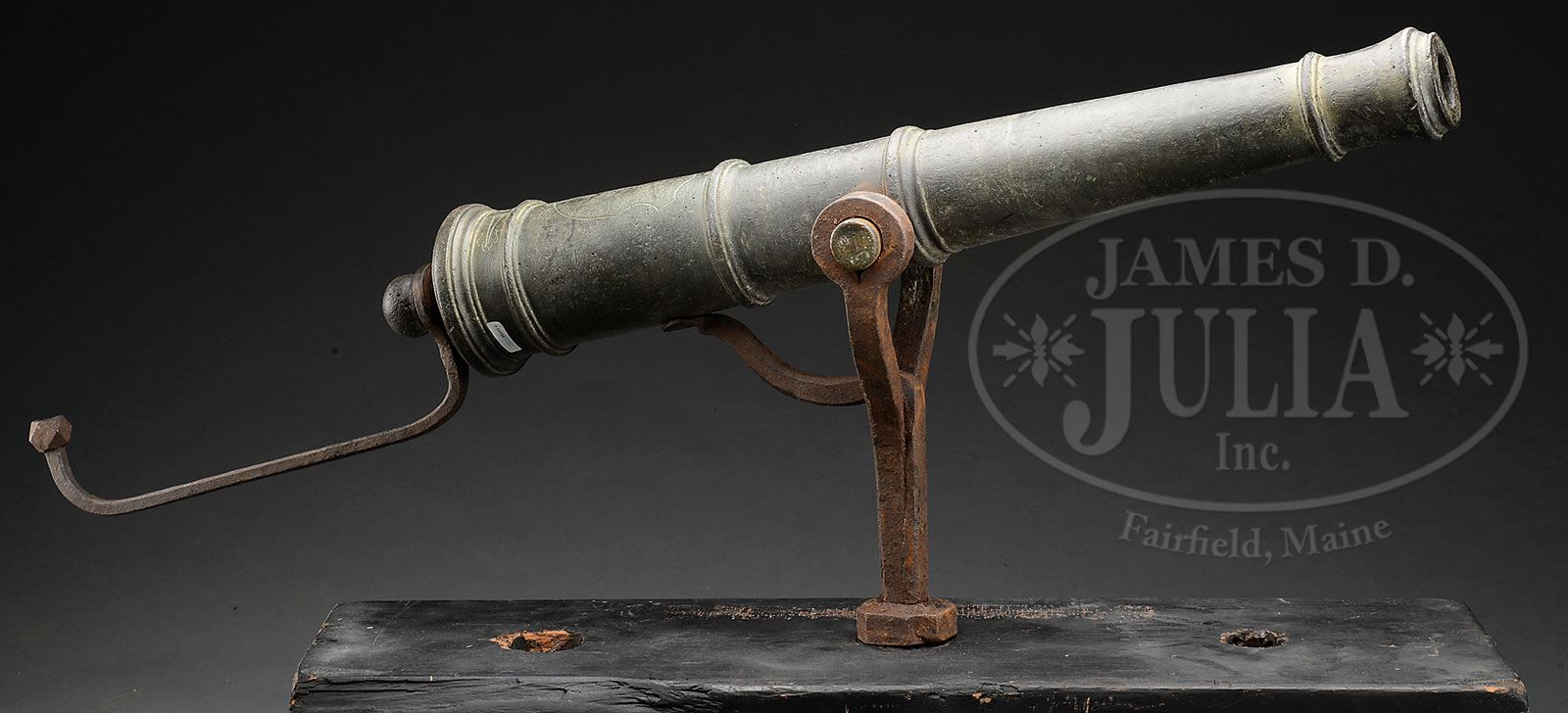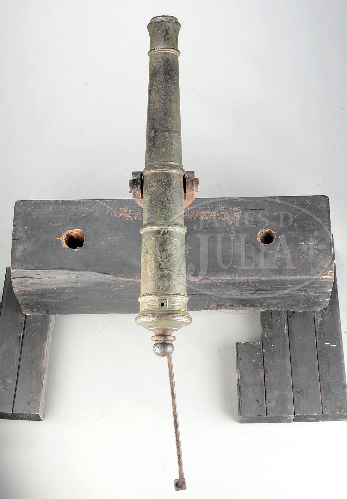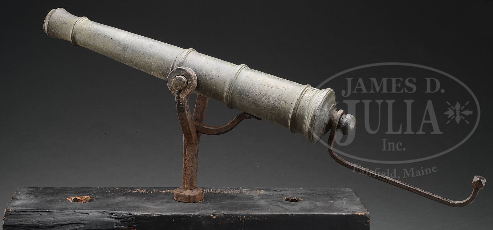 SN NSN. This rare 1/2 Pounder made between 1746-1755 by Dutch master gunfounder Jan Verbruggen at Enkhuizen is one of only 3 surviving swivel guns known to have been made by him. This particular gun weighs 161 lbs, including yoke, and measures about 39″ from muzzle to end of round cascabel. Cannon is mounted on an iron yoke and has rarely seen orig iron “tiller” attached to cascabel, which was used to aim and maneuver tube. The iron swivel yoke and “tiller” are well forged and typical of the period. This cannon shot a 1-3/4″ smooth projectile and was probably used on a ship or rampart. There are four raised bands between the flared muzzle and the flared breech as can be seen in pictures, very similar to 6- & 9-pounders of the era that were for field use. This cannon bears the maker’s markings “I.V.B.” faintly marked on the breech ring; also a 3/4″ proof mark of Enkhuizen that is indiscernible along with a 6″ stippled shield that has the number 131 above it. Verbruggen is best known for his work in the foundry at Woolwich, England where he cast guns for the British during the American Revolution. This cannon came out of the New York area. PROVENANCE: Mark McConnell. Craig Bell. Warrenton VA Museum. Springfield Arsenal, LLC Artillery Collection. CONDITION: Tube overall is well patinated with verdigris & some erosion. Vent hole is a bit wallowed out. Iron hardware is sound with patina, and overall brown with pitting & rust. Markings are only partially discernible as can be seen in pictures. 4-54108 (10,000-15,000) – Lot 2071