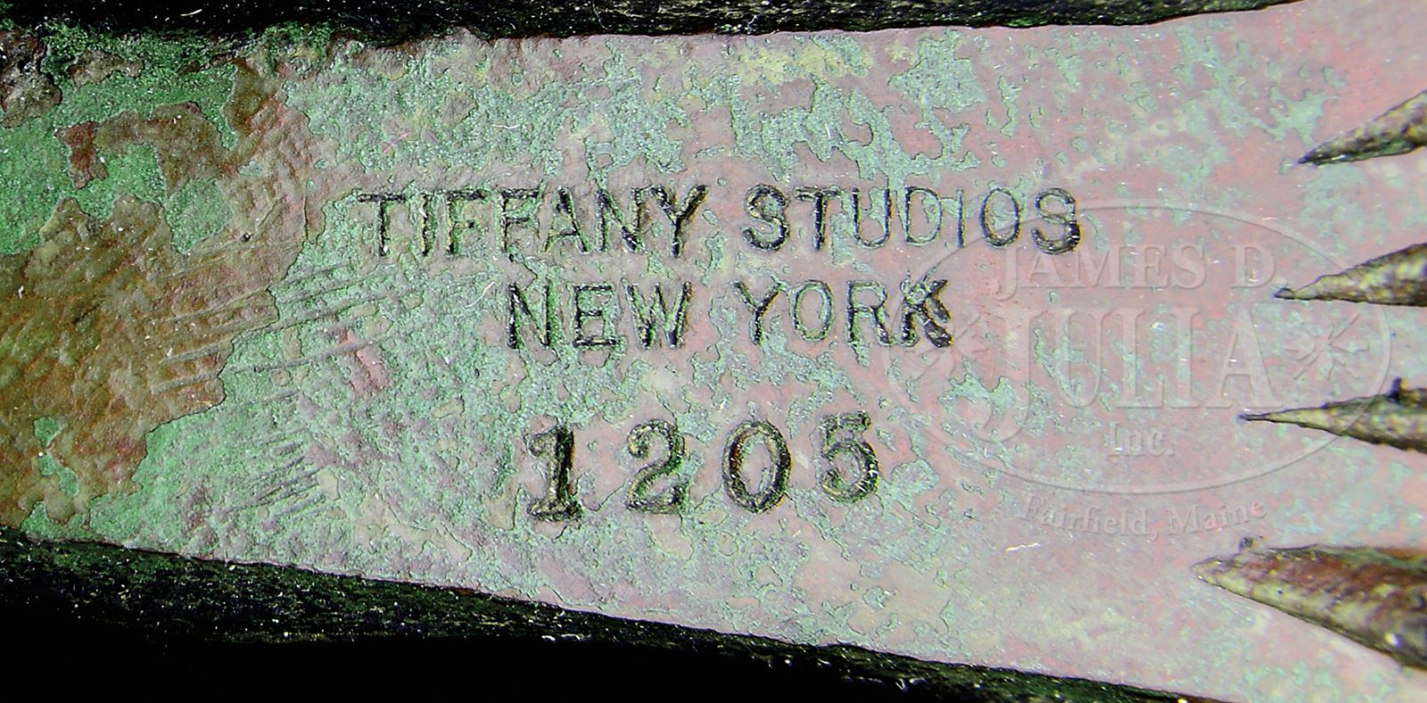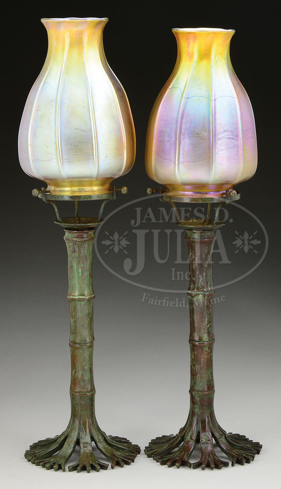 PAIR OF TIFFANY STUDIOS BAMBOO CANDLE LAMPS.Candle lamps have bronze bamboo candlesticks with rich brown patina with green and subtle red highlights. One signed on underside “Tiffany Studios 1205” other signed “Tiffany Studios New York 1205”. Candlesticks support Tiffany gold favrile shades with vertically ribbed bodies. Gold iridescence shows flashes of pink, purple and green. Each signed in fitter “L.C.T.” SIZE: 18-3/4″ t. CONDITION: Very good to excellent. 50429-35 (6,000-8,000) – Lot 2072