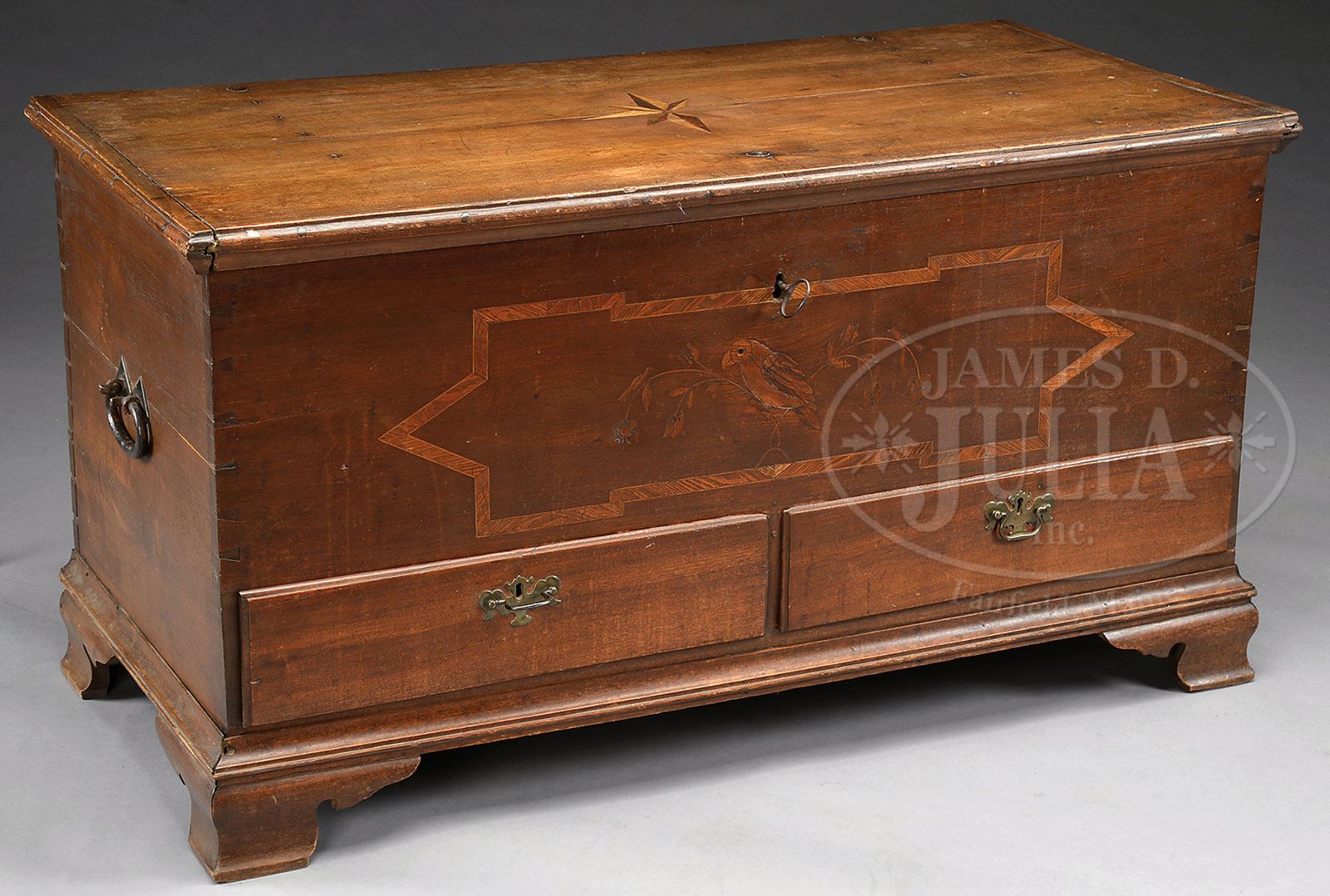 TWO DRAWER PENNSYLVANIA WALNUT BLANKET CHEST WITH OGEE BRACKET BASE. A fine example of a Pennsylvania dovetail blanket chest with inlaid parrot and tulip front. The two board top is inlaid with a mariner’s compass, fitted with forged iron handles, retaining it’s original lock, key and strap hinges. Having a lidded interior till. SIZE: 50-1/2″ w 23-1/2″ d x 26-1/2″ h. PROVENANCE: From a fine Kentucky Estate. CONDITION: Filled drying split in top and very minor restoration to the base. 9-92217 (1,500-2,500)