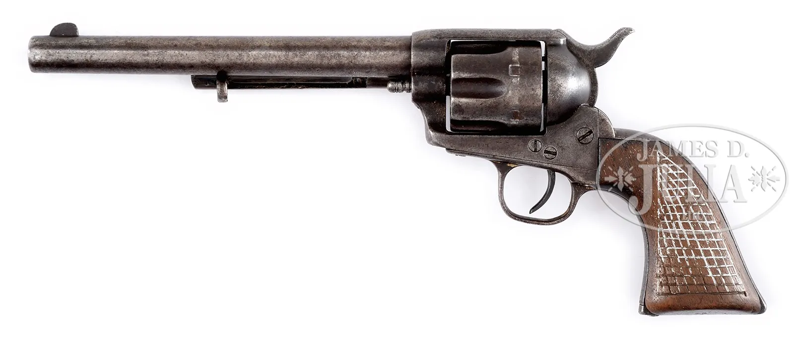 PRIME ‘LOT 5’CUSTER RANGE AINSWORTH INSPECTED COLT SINGLE ACTION ARMY REVOLVER.SN 5109. Cal. 45. This revolver, SN 5109, is accompanied by a letter of authentication by Colt Single Action expert John A. Kopec. Mr. Kopec states that the serial number of this revolver, “5109”, places it in ‘Lot Five’ of the Ainsworth-inspected Single Action Cavalry revolvers. The 600 ‘Lot Five’ revolvers are considered to be the pistols primarily issued to Custer’s 7th Cavalry and carried at the Battle of Little Bighorn in June 1876. This revolver falls within a group of identified 7th Cavalry revolvers that include serial numbers 5100 (Custer Battle pickup), 5133, 5147 (Troop L, 7th Cavalry), 5153 and 5180 and falls only 19 SNs apart from revolver SN 5128 which is documented to have been captured by Spotted Crow at the Battle of the Little Big Horn. This revolver conforms to other martial early Colt single actions with 7-1/2″ bbl with Hartford single line address. Left side of frame marked with 2-line patents and “US”. Grips fit gun well and appear orig to gun, though they have been “custom checkered” during period of use with no discernible cartouche remaining or SN. This is an honest complete survivor of the U.S. military, made 2 years prior to the Little Big Horn. PROVENANCE: The Dr. Robert G. Cox Estate Collection. CONDITION: Revolver appears orig and complete with exception of replaced ejector tube, base pin and base pin screw. Kopec mentions in his letter that the firing pin has been modified also. Matching SN 5109 are found on bbl, frame, trigger guard, cyl and backstrap. Ainsworth “A” sub inspector marks are still easily seen on cyl, backstrap and trigger guard. Metal overall is gray/brown with staining and pitting. Replaced ejector housing is cleaned and ejector housing screw does not bind. Bbl address and SNs are all well struck and easily discerned, though a couple of numbers worn on cyl and bbl. Stocks appear to have been silver painted, now hand worn showing paint in crevices of cross hatch carving and some crevices. Mechanically gun is sound and functional with fairly crisp discernible rifling in bore. 50018-157 JS (5,000-8,000) – Lot 2073 Click here to view provenance