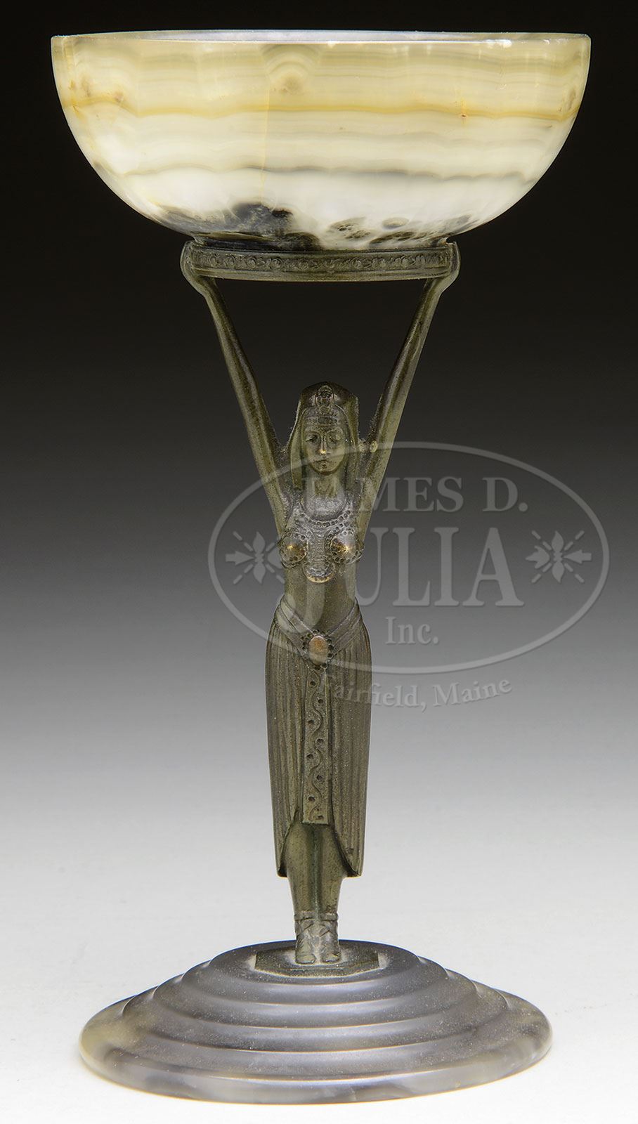 AUSTRIAN AGATE & BRONZE COMPOTE.Austrian compote has round stepped agate base supporting a bronze figure of an Egyptian woman with hands raised supporting the carved agate bowl. The bronze figure is finished in a rich brown patina and the piece is marked on the underside “Austria”. SIZE: 8-3/8″ t. CONDITION: Very good to excellent. 5-69383 (1,000-1,500) – Lot 2076