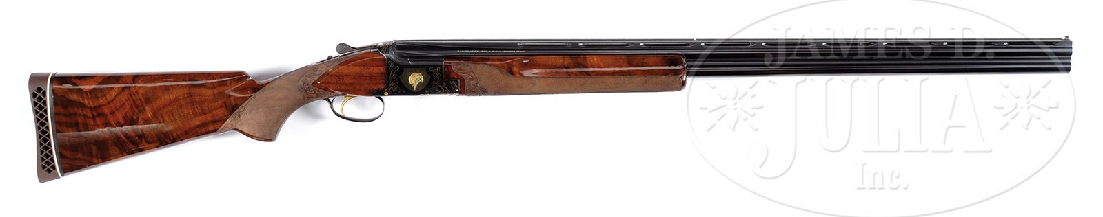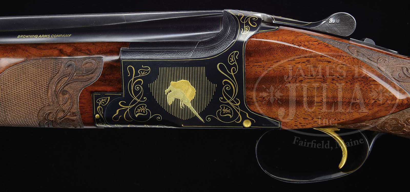 *VERY FINE BROWNING EXHIBITION GRADE TRAP SUPERPOSED WITH TWO COLOR FLUSH AND RELIEF GOLD INLAY BY G. VANDERSMISSEN.SN 71196S7. Cal. 12 ga. 2-3/4” Chambers. This very fine Browning is embellished by one of Belgium’s best engravers. It has 32″ bbls, marked for Imod and full, which are gold inlaid with “Browning Arms Co” on left, and “12 GA – SHELLS 2-3/4″ – MADE IN BELGIUM – BROWNING PATENT” on right. Bbls have “broadway” trap, ventilated rib with white synthetic Bradley front sight, and “certifiable pre-ban ivory” mid bead. Blued standard Browning OU action with gold-plated sgl selective trigger, is masterfully flush inlaid with gold and yellow gold scrolled ribbons outlining unusual gold inlaid portraits of retriever retrieving game, superimposed on flush inlaid gold line shield devices; gold dog retrieves a yellow gold pheasant on left, and another with duck on right. Bottom of action portrays a relief gold duck flying over flush yellow gold mountains in gold line arched background. More two color gold ribbons are on trigger guard bow. This unique inlay is signed “Vandersmissen G” on bottom rear portions of both sides. Nicely flame figured claro walnut short tang flat knob buttstock measures 14-3/8” over Browning open sided white line pad. Checkering has relief carved acanthus finials and wraps over top of grip. Matching forend is of 1-pc flared beavertail type. Bore diameter: top -.724, bottom -.725. Bore restrictions: top: .036 (full), bottom: .022 (mod). Drop at heel: 1-1/2″, drop at comb: 1-1/2″. Weight: 8 lbs 9 oz. LOP: 14-3/8″. PROVENANCE: The Collection of Robert Burg. Special Note: This item contains or is made of ivory. Do not bid on this lot unless you have read and agreed to our "Ivory Position Statement" and the "Waiver of Legal and Financial Risk to James D. Julia in regards to your Purchase of an Ivory Object." This information is located in the front section of our catalog. CONDITION: Excellent, showing limited use, with some sharp edge wear on blued parts, and a few light handling marks on gloss finish of wood, checkering slightly darkened. Mechanically excellent. 49100-16 MGM252 IVORY (20,000-30,000) – Lot 2077