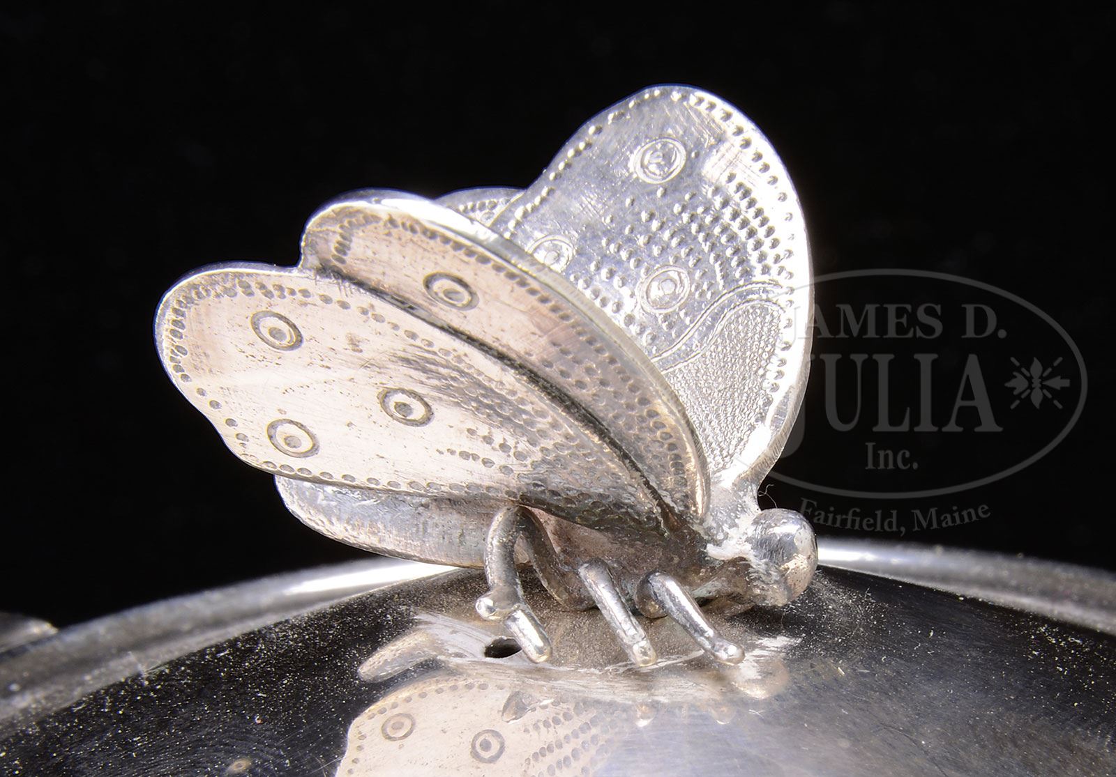 GORHAM STERLING SILVER TEA SERVICE.Gorham sterling silver tea service in the Medallion pattern has tea pot and coffee pot, covered sugar and creamer and waste bowl. Each piece has a simple spherical body with a raised vertically ribbed band surrounding the center with a medallion on each side. Each of the lids is finished with a detailed sterling silver butterfly finial and each pot handle is mounted with bone insulators. Marked on the underside with Gorham lion, anchor and “G” hallmarks, “Bailey & Co. Sterling 212B”. There is also a “B” datemark for 1869 as per the Gorham datemark chart. Total weight is approx. 96.98 troy oz. SIZE: Pots are 7-1/4″ t to top of handle. CONDITION: There are some very minor tiny dents to the sides of each piece consistent with age and use, otherwise very good to excellent. 5-69849 (4,000-5,000) – Lot 2079