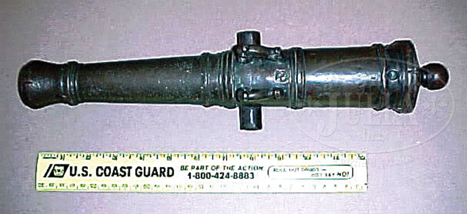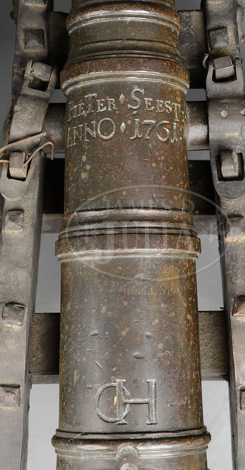 SN NSN. This is a beautiful pair of small Dutch cannon mounted on split trail carriages which appear contemporary to manufacture. Dutch Family cannons from this era are well known, but this pair could possibly be sales samples from the offices of the Dutch East India Company. This idea is based on the fact that Pieter Seest made many cannons for this company that bear their markings and the “OH’ monogram on the breech possibly stands for “Ostindische Huis” which, from Dutch, translates to “East India House” which was the name of the building in Amsterdam headquartering Dutch East India Company. Regardless of origin, this is a beautiful pair of 18th century cannon on very old carriages. PROVENANCE: Springfield Arsenal, LLC Artillery Collection. CONDITION: Bbls have bronze patina and crisp fine markings as seen in photographs. Carriages are sound and solid and fit tubes fairly well. Quality of bronze cast ornamentation appears of similar quality and vintage with a darker patination. Wood carriage and wheels are not of great quality in comparison to casting on bronze, but are sound & functional. Carriages are totally brass mounted, even the bolts and treads on wheels are cast bronze instead of iron. There are several cracks in cheek pieces, which each is made in several sections. Trunnion caps which are also bronze and intact other than one missing and one trunnion clasp. These are not an exact pair with slightly different muzzles, cascabels and banding, however both cannon are about 20″ long and weigh about 20 lbs. Though maker marks are cut almost identically, one has the city emblem for Amsterdam as seen in photos and the other does not. These carriages are difficult to date and could be a later addition, but no doubt they are quite old and the correct form for the period with good patina. 4-54084 (8,000-12,000) – Lot 2079