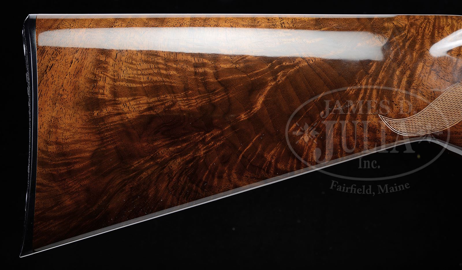 SN 63159V70. Cal. 20 ga. 3” Chambers. 26-3/8” Bbls are marked for IC and Mod. Bbls have narrow, raised, matted, ventilated rib and aluminum bead and are marked with Browning Morgan Utah and Montreal addresses, and “MADE IN BELGIUM” on left, and “BROWNING SUPERPOSED”, steel, chamber and patent info on right. There are 2” triangles of well-cut relief open shaded scroll at breech ends. Blued standard Browning OU action with gold-plated sgl selective trigger, is engraved in typical Midas style, as designed by Louis Vrancken, consisting of near full coverage of large open shaded scroll with acanthus highlights surrounding game scenes with semi-relief gold inlaid subjects. These scenes are within gold inlaid ovoid borders with flourishes at bottom. Three pheasant fly into open meadow on left side of action, and a trio of ducks take wing from marsh on right. A quail flies across bottom of action. Trigger guard, with matching scroll, has vacant shield on bow. Engravers name “Beunet” is signed on bottom left. Bottom right is signed “L. Cortis”. Fine feather crotch figured claro walnut long tang flat knob buttstock measures 14-3/8” over Browning composition buttplate. Modified point pattern checkering extends over grip and has flourishes into butt. Matching forend is of 1-pc field type. Bore diameter: top -.618, bottom -.618. Bore restrictions: top -.011 (lt mod), bottom -.004 (IC). Drop at heel: 2″, drop at comb: 1-5/16″. Weight: 6 lbs 3 oz. LOP: 14-3/8″. Black and gold box has correct end label for this particular gun. CONDITION: Excellent, essentially as new, appears unfired since proof, with only a few light handling marks on wood and metal. Gold is excellent, but with slight lifting on finger blade. Mechanically crisp. Box is fine with chipping on edges. Label is excellent, foxed. 49033-19 MGM230 (11,000-13,000) – Lot 2079