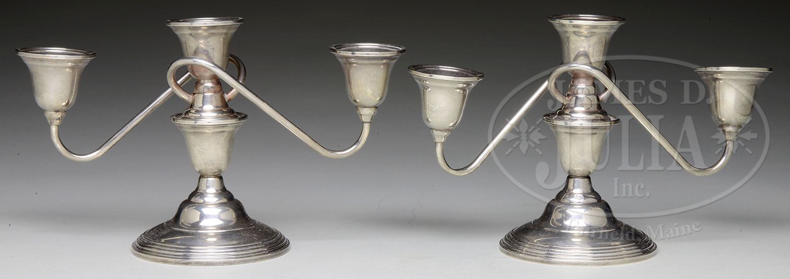 PAIR OF STERLING SILVER CANDLESTICKS.Pair of William Rogers candlesticks have round stepped foot and inverted bell shaped stem supporting a center candle cup and 2 curving arms each terminating in a candle cup. Marked on the underside “Wm. Rogers Mfg. Co. Sterling Weighted Reinforced 5F”. SIZE: 6-3/8″ t x 9-1/2″ w. CONDITION: Some minor dents to the side of each foot, otherwise very good to excellent. 5-69614 (300-500) – Lot 2081