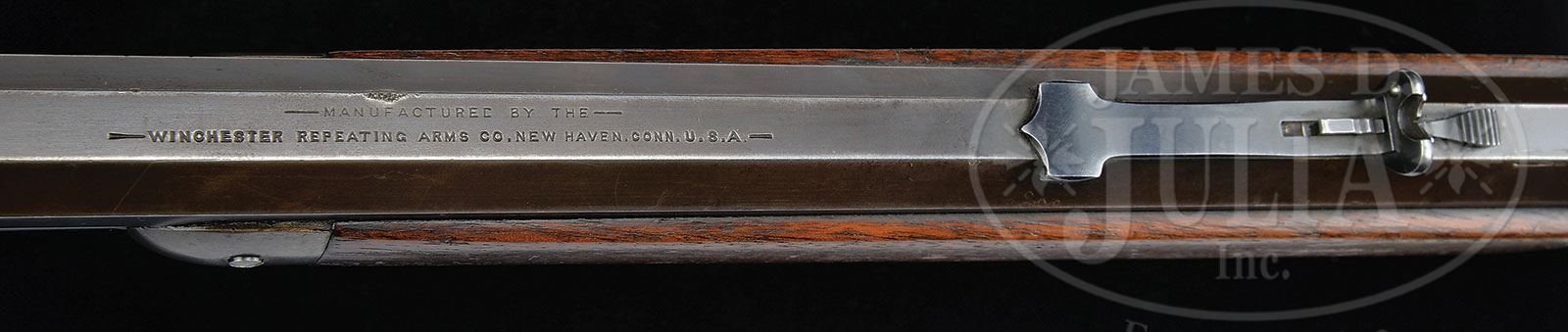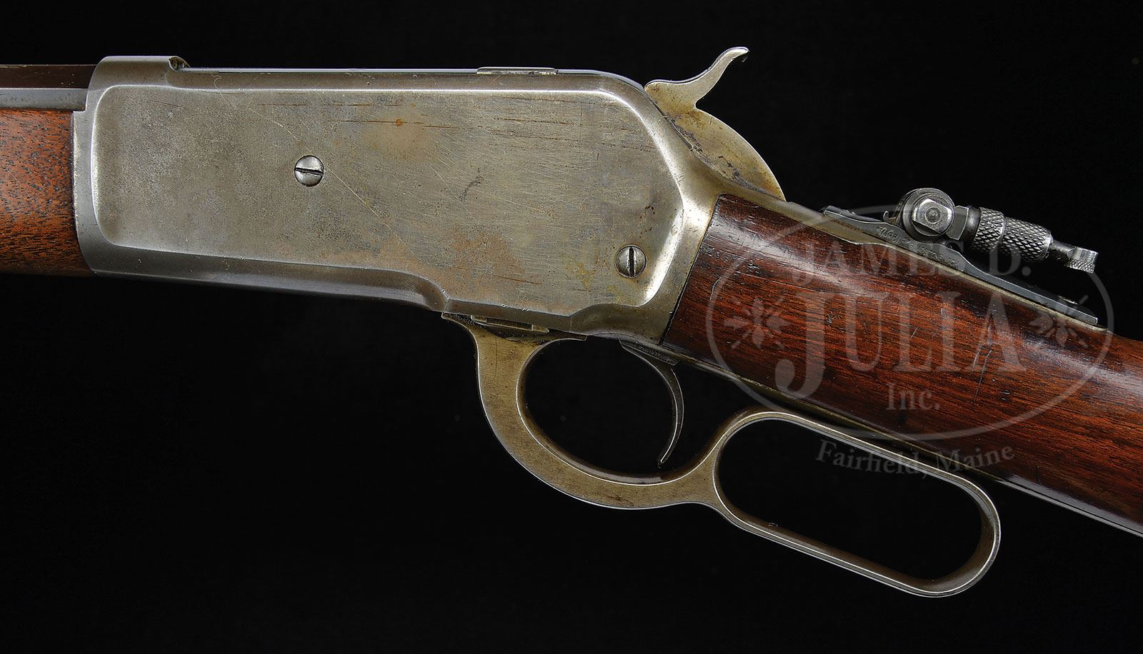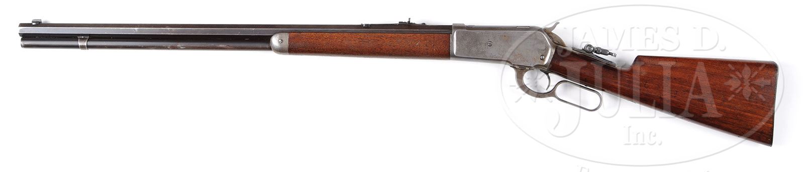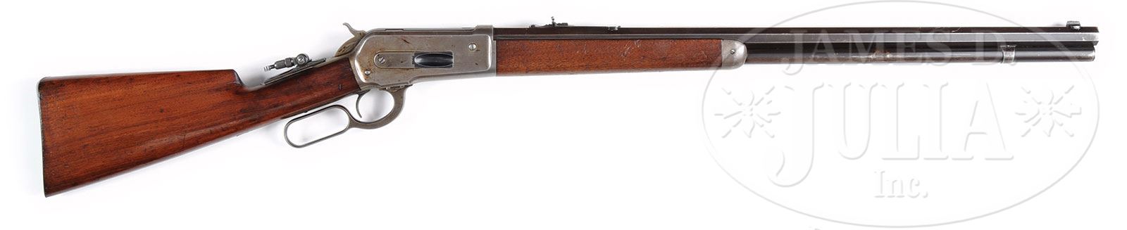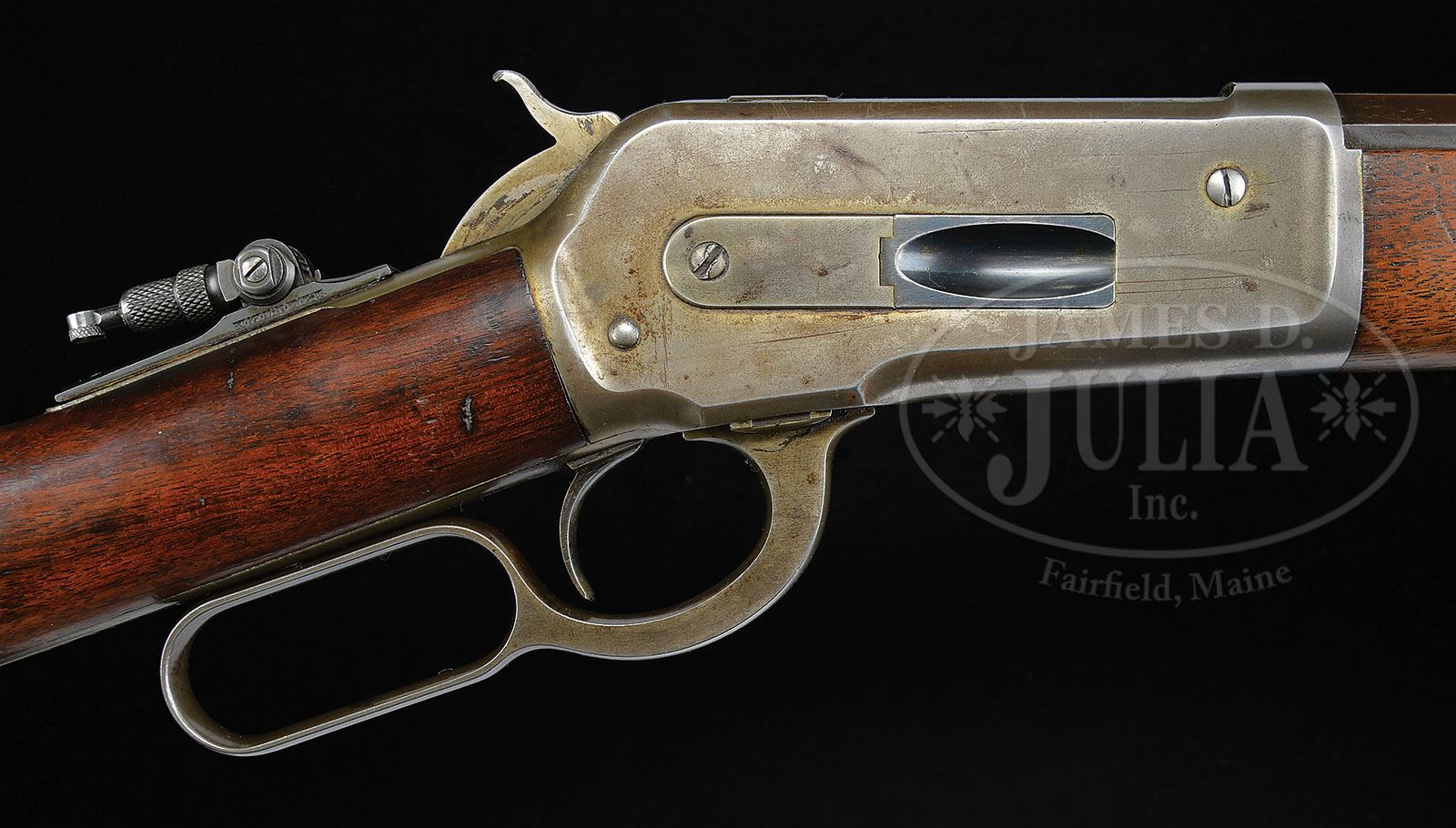 SCARCE MODEL 1886 WINCHESTER EXPRESS CALIBER RIFLE.SN 60044. 50 Express Cal. (50-110). Blue and case color. 26″ oct bbl with full length magazine, typical address and Cal. markings with fixed front sight and adjustable semi buckhorn rear sight; Marble patented tang sight. Mounted with strait grain American walnut with smooth iron shotgun buttplate. Winchester factory research should show this gun shipped August 26, 1891. This rifle weighs 9 lbs, and Express Cal. are scarce. PROVENANCE: Jack Kessner, Great Falls, MT. Lewis Yearout 1959. Estate Collection of Lewis & Leyton Yearout. CONDITION: Very good to fine overall, traces of blue finish can be seen in protected areas of bbl and magazine. Strong blue is found on top of breech and loading gate and traces of blue on trigger. Traces of case colors can be found in protected areas of frame, lever and hammer with balance gray/silver. Markings are all discernible. Stocks are sound and well fit with traces of varnish on forestock and 90% of an old revarnish on buttstock. Front sight marked Redfield’s appears orig to time of use, Marble tang sight retains much of its orig dull blue color. Mechanically gun functions well, rifling is well discerned in a pitted bore. 4-53837 JS123 (6,000-10,000) – Lot 2081 Click here to view provenance