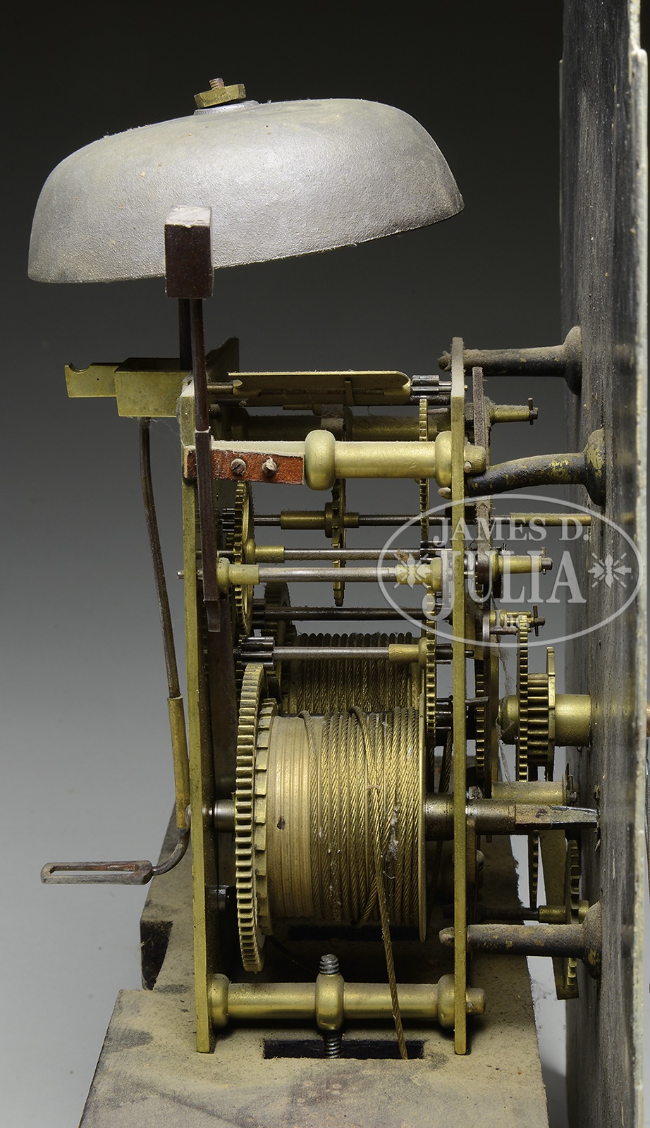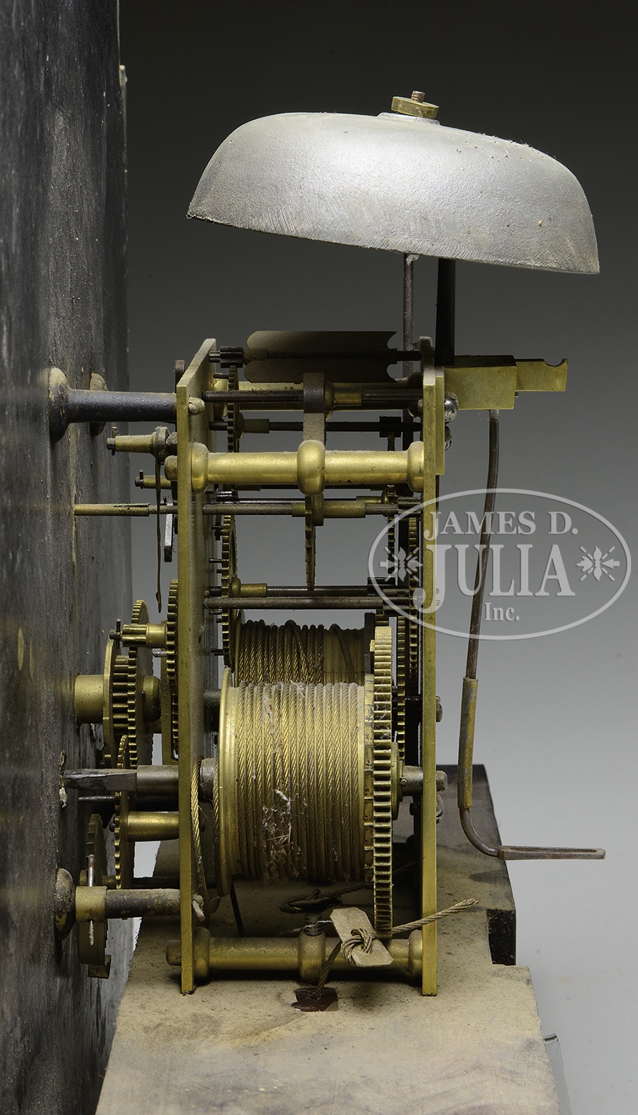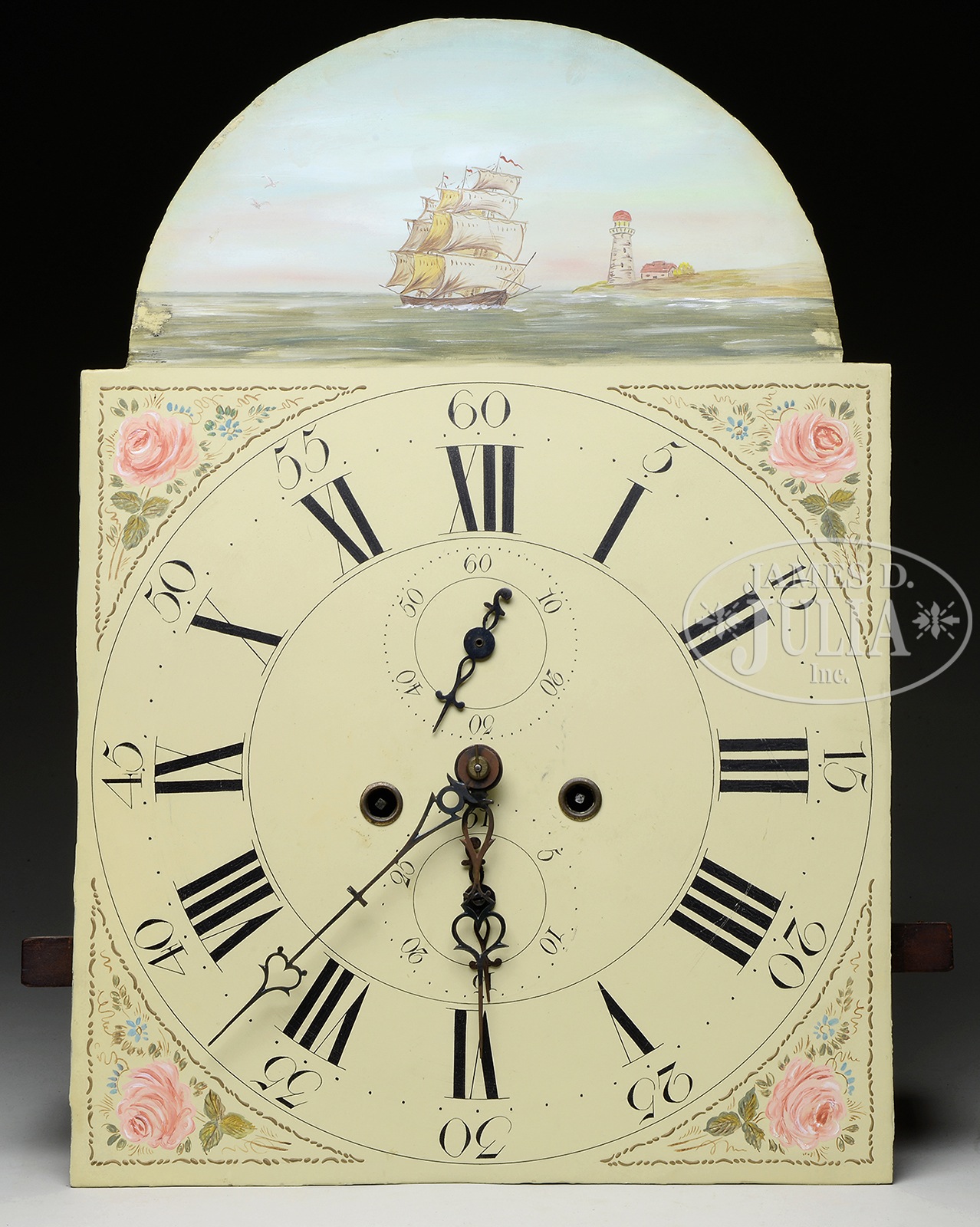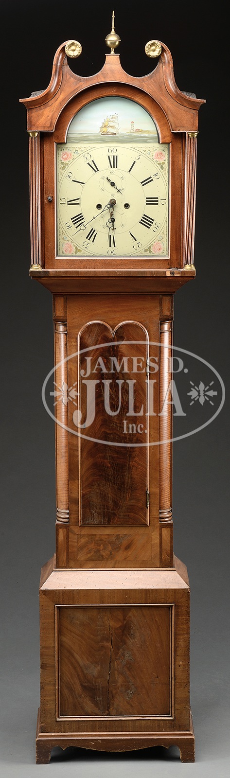 AMERICAN MAHOGANY TALL CASE CLOCK WITH BROKEN ARCH BONNET.Late 18th century. Broken arch pediment bonnet having brass rosettes and finial with outset reeded columns. The mahogany case with inset quarter columns overlaid with figured mahogany, and block faced pediment and capitol. Crotch mahogany faced door with double tombstone top, base with inset and molded crotch mahogany panel, all sitting atop a scrolling bracket base. Brass time and strike weight driven movement having iron painted dial with ships and flowers. SIZE: 87-1/2″ h. CONDITION: Bonnet top scrolls and finial re-glued after earlier reduction in bonnet height. Bracket base, an old replacement. Case, having old refinish. Dial, nicely repainted. 9-94876 (2,500-4,500) – Lot 2081
