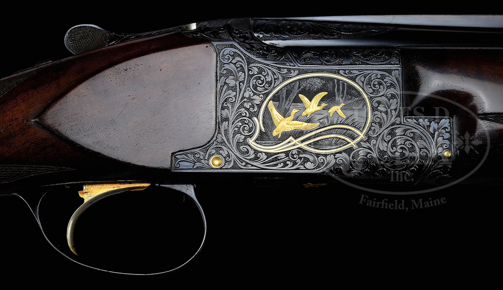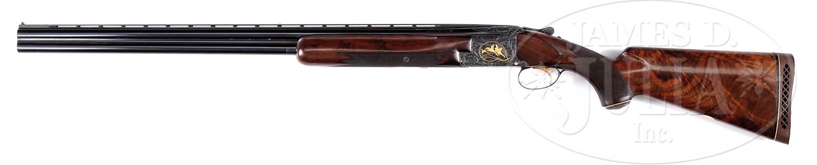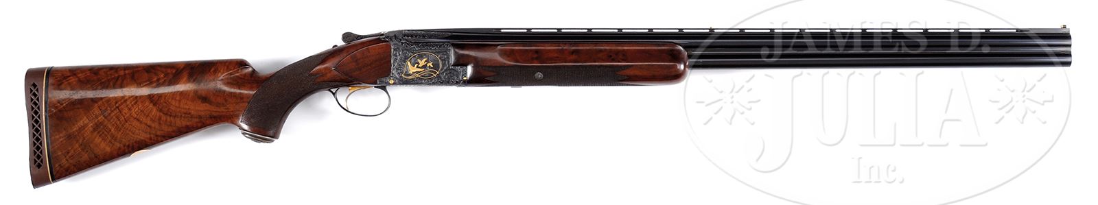 *EARLY BROWNING MIDAS HEAVY GAME GUN ENGRAVED AND GOLD INLAID BY L. VRANCKEN.SN 82372. Cal. 12 Ga. 2-3/4” Chambers. 30” Bbls are marked for Imod and full. Bbls have raised, matted, ventilated rib fitted with Bradley composition front bead and “certifiable pre-ban ivory” mid-bead and are marked with “BROWNING ARMS COMPANY” with St. Louis and Montreal addresses, and steel and chamber info on left. Patent info and “MADE IN BELGIUM” are on right. There are 2” triangles of well-cut relief open shaded scroll at breech ends. Blued standard Browning OU action with gold-plated sgl selective trigger, is engraved in typical Midas style, as designed by Louis Vrancken, and in this case game scenes and engraving are by Vrancken. This design consists of near full coverage of large open shaded scroll with acanthus highlights surrounding game scenes with semi-relief gold inlaid subjects. These scenes are inside gold inlaid ovoid borders with flourishes at bottom. Three pheasant fly into open meadow on left side of action, and a trio of ducks take wing from marsh on right. A quail flies across bottom of action. Trigger guard, with matching scroll, has vacant shield on bow. This fine engraving is signed by L. Vrancken, at bottom rear of both sides of action and at bottom rear of both game scenes. Nicely crotch figured American walnut long tang flat knob buttstock measures 14-3/8” over leather faced open sided Browning white line pad. Modified point pattern checkering wraps over top of grip. A deeply embossed silver grip cap with initial “G” has been fitted. A gold oval on toe line has had engraving erased. Matching forend is of beavertail type. Bore diameter: top -.723, bottom -.723. Bore restrictions: top -.036 (full), bottom -.025 (mod). Drop at heel: 1-7/8″, drop at comb: 1-7/16″. Weight: 7 lbs 13 oz. LOP: 14-3/8″. Special Note: This item contains or is made of ivory. Do not bid on this lot unless you have read and agreed to our "Ivory Position Statement" and the "Waiver of Legal and Financial Risk to James D. Julia in regards to your Purchase of an Ivory Object." This information is located in the front section of our catalog. CONDITION: Excellent, showing limited field use, with high edge wear on all blued parts, slight silvering on trigger guard and thumbpiece. Stocks retain over 90% orig finish with some areas worn through and oil darkened. Gold of trigger has considerably silvered on finger blade. Bores are excellent. Mechanically crisp. One of the first Vrancken designed Midas grade Brownings, this gun was made in 1960. 49432-9 MGM360 IVORY (6,500-10,000) – Lot 2081