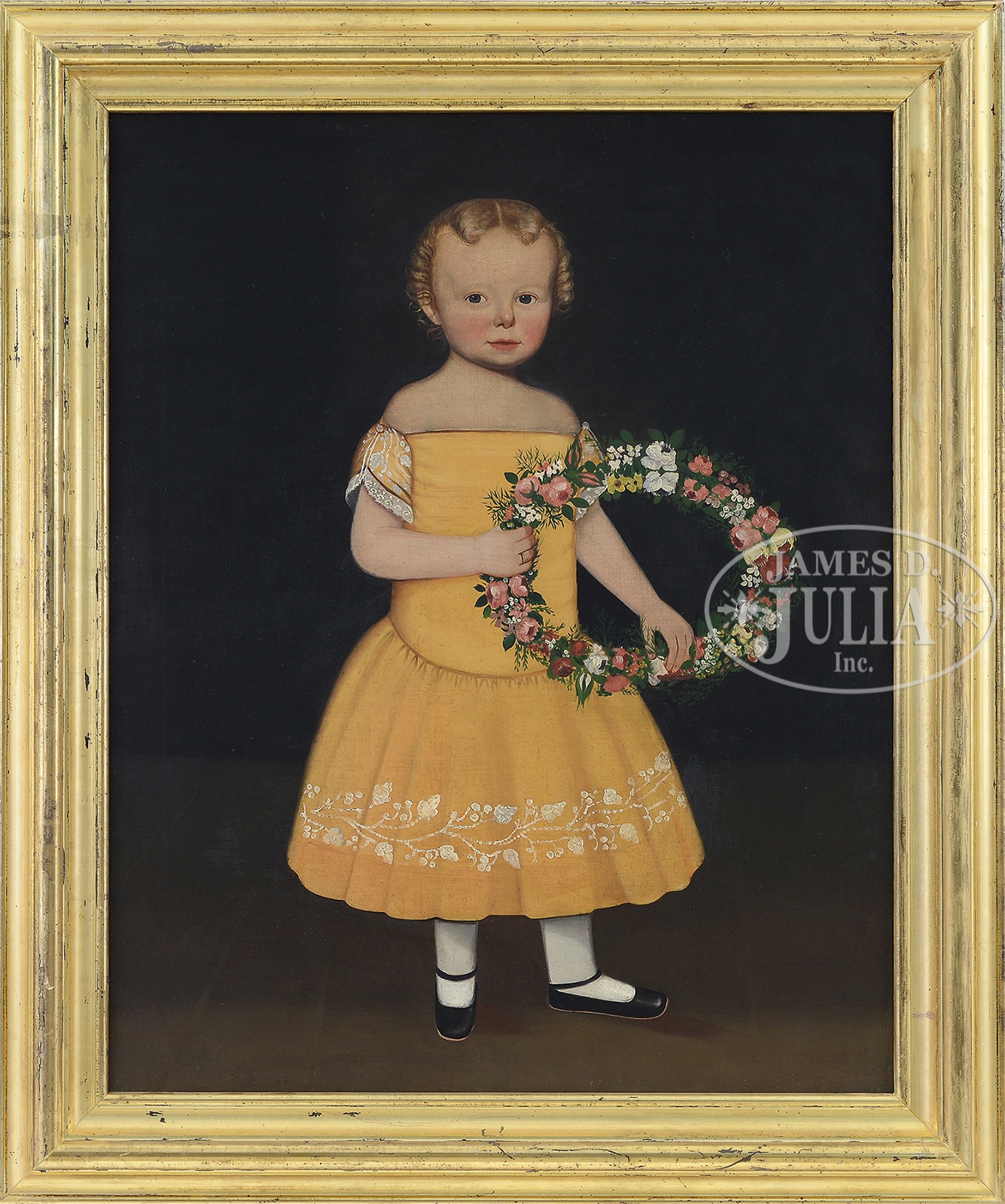 Please Note: There is a tear in the child’s dress approximately 1″. UNSIGNED (American, Mid 19th Century) PORTRAIT OF A GIRL IN YELLOW DRESS HOLDING FLOWER WREATH.Fabulous oil on canvas full length portrait of a young girl standing wearing a gold/yellow dress decorated with a vine of leaf & flowers. She wears black shoes & white stockings and holds a wreath of colorful flowers including white, pink & red roses. She has curly brown hair, blue/green eyes, red lips and pink cheeks. Housed in a period lemon gold molded wood frame. On verso of canvas has a canvas stamp as follows “S.N. Dodges/Artist & Painters/Supply Store/189 Chatham Cor/of Oliver St./ N.York”. NOTE: Through our research there has been a few portraits attributed to G. Gustemer which later have been properly attributed to George Gassner. Similar features include the floorboards the child stands on, the positioning of the feet, the holding of an item, the style of dress, the facial features amongst other similarities. SIZE: 36″ x 29″. Overall: 43″ x 36″. CONDITION: There are two small patches & another on reverse with corresponding minor inpainting. Very good. 50919-1 (7,000-10,000) – Lot 2081