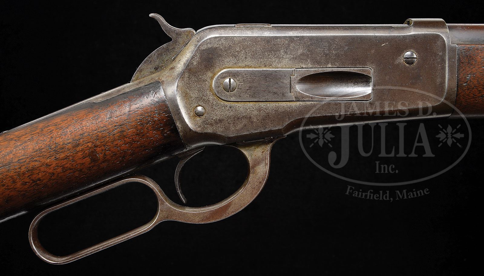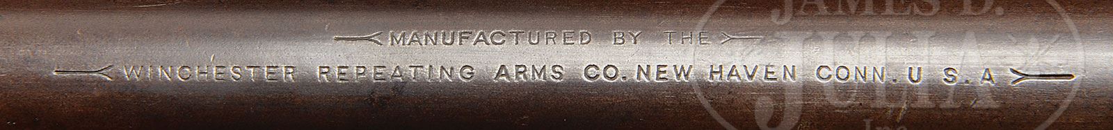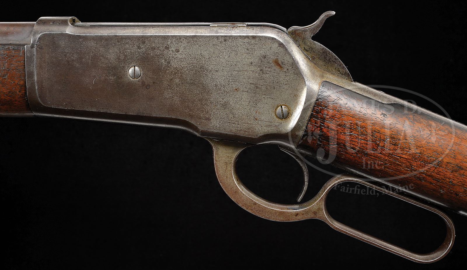 RARE SPECIAL ORDER WINCHESTER MODEL 1886 BIG 50 LEVER ACTION SHORT RIFLE.SN 42801. Cal. 50 Ex. (50-110). Standard grade rifle with 22″ rnd bbl, button magazine with altered Lyman Jack front sight and 900-yard carbine ladder rear sight. Mounted with uncheckered, straight grain American walnut with straight stock & smooth steel shotgun buttplate. Accompanied by a Cody Firearms Museum letter which identifies this rifle in caliber 50-110 with 22″ rnd bbl, plain trigger, half magazine, shotgun butt, “8 pounds” and “comment: ‘standard sights’, (point blank 150 yards)”, received in warehouse May 27, 1890 and shipped June 6, 1890 to Order #12695. This rifle is somewhat unusual, not only from the aspect of the 22″ bbl & button magazine but the fact that it is not British proofed. A large proportion of similar configuration ’86s examined by this cataloger are British proofed for the India & Africa markets. CONDITION: Very good. Bbl retains blue in the most sheltered areas being mostly a blue/brown patina with several small nicks over the top and both sides and a few small spots of pitting on the left side over the forearm area; receiver retains about 40% silvered case colors with the balance turned dark; lever & hammer retain faded case colors. Wood is sound with the stock retaining about 40-50% thin orig finish and the balance of the wood a hand-worn patina. Mechanics are fine, sharp bright bore with moderate pitting. 4-51948 (5,000-8,000) – Lot 2082 Click here to view provenance