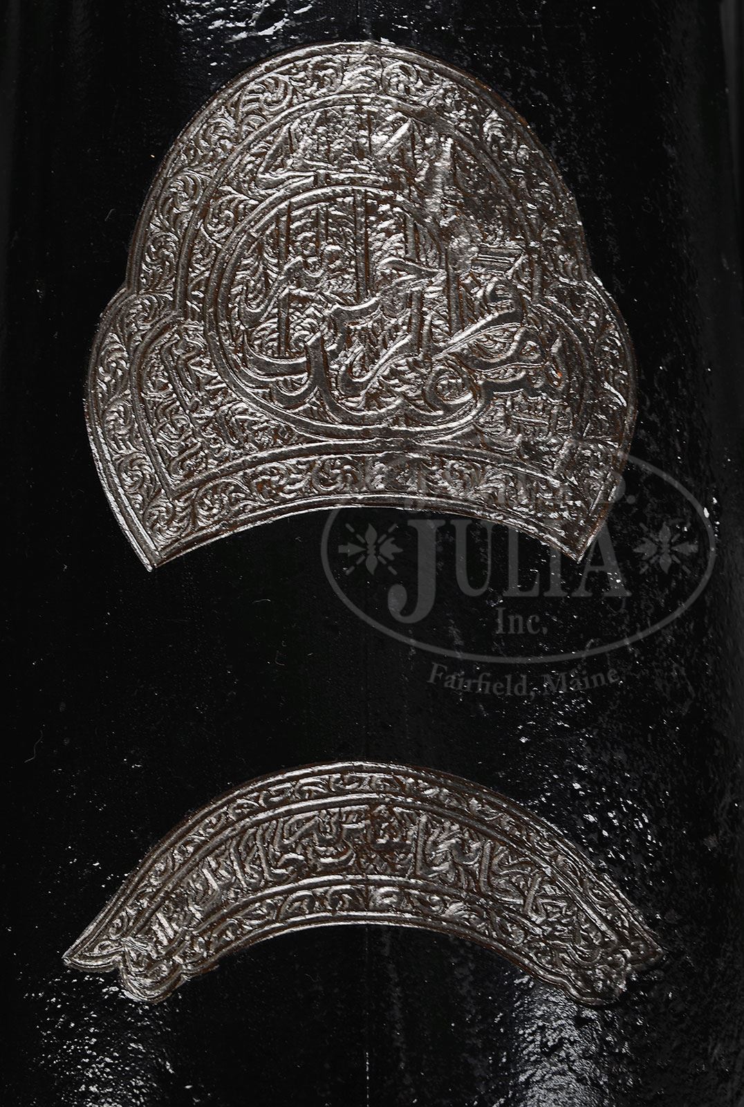 PAIR OF MID 19th CENTURY AFGHAN 4-POUNDER STEEL MOUNTAIN RIFLES.This rare pair of well marked British style mountain rifles have Afghani crests and makers marks on top of bbls forward of vents. The presentation in the large shield engraved on bbl translates from Pashto “Presenting Kahn Laeis Abdur Rahman” Laeis is a title similar to emir or excellency. Abdur Rahaman Kahn (1840-1901) ruled Afghanistan from May 31, 1880 til his death. He was a pivotal leader following the second Anglo-Afghan war where these cannon were most likely used. Kahn negotiated with Russia, England and India to minimize their influence in Afghanistan, instituted programs of modernization and uniting or at least suppressing the many tribes. However, he was brutal in his dealings with internal opposition, as well as a forceful proponent of Islam against the non-Islamic peoples of the country and was known as “The Iron Emir”. These rifled cast-steel cannon appear as well made as their British counterparts. The crescent shape marking on the presentation shield on bbl translate “Kabul Engraving and Machinery House”. This company may not have been the manufacturers of the cannon but just the engravers of the presentation. Abdur Rahman was a military leader and governor in the 1860’s of the northern province when political turmoil caused his exile to Russian Turkestan in 1869. He remained in exile until 1880, when he was recognized by the Russians and the British as new emir. Kahn was adept at keeping the British and Russians appeased and not on his soil. These guns employed the French-originated “La Hitte” system of rifling in which the iron shells had projecting zinc studs which rode in the spiral grooves of the barrel to give the projectiles the required spinning motion. These wonderful survivors were rescued by a former American Special Forces Officer who purchased them in Kabul during the early phases of our recent war on terror in Afghanistan. A cast-zinc reproduction projectile is included. This impressive pair of cannons would look great in the foyer of your home or on the ramparts of your castle. PROVENANCE: Springfield Arsenal, LLC Artillery Collection. CONDITION: Tubes measure about 44″ overall and 11″ wide at trunnions. Bores measure about 2-1/4″, markings are discernible as can be seen in photographs. Surfaces are pitted though overall smooth where cleaned & painted as can be seen in photographs. Bores have discernible rifling though pitted. Vents & bores are clear. 4-54206 (7,000-8,000) – Lot 2082 Click here to view provenance