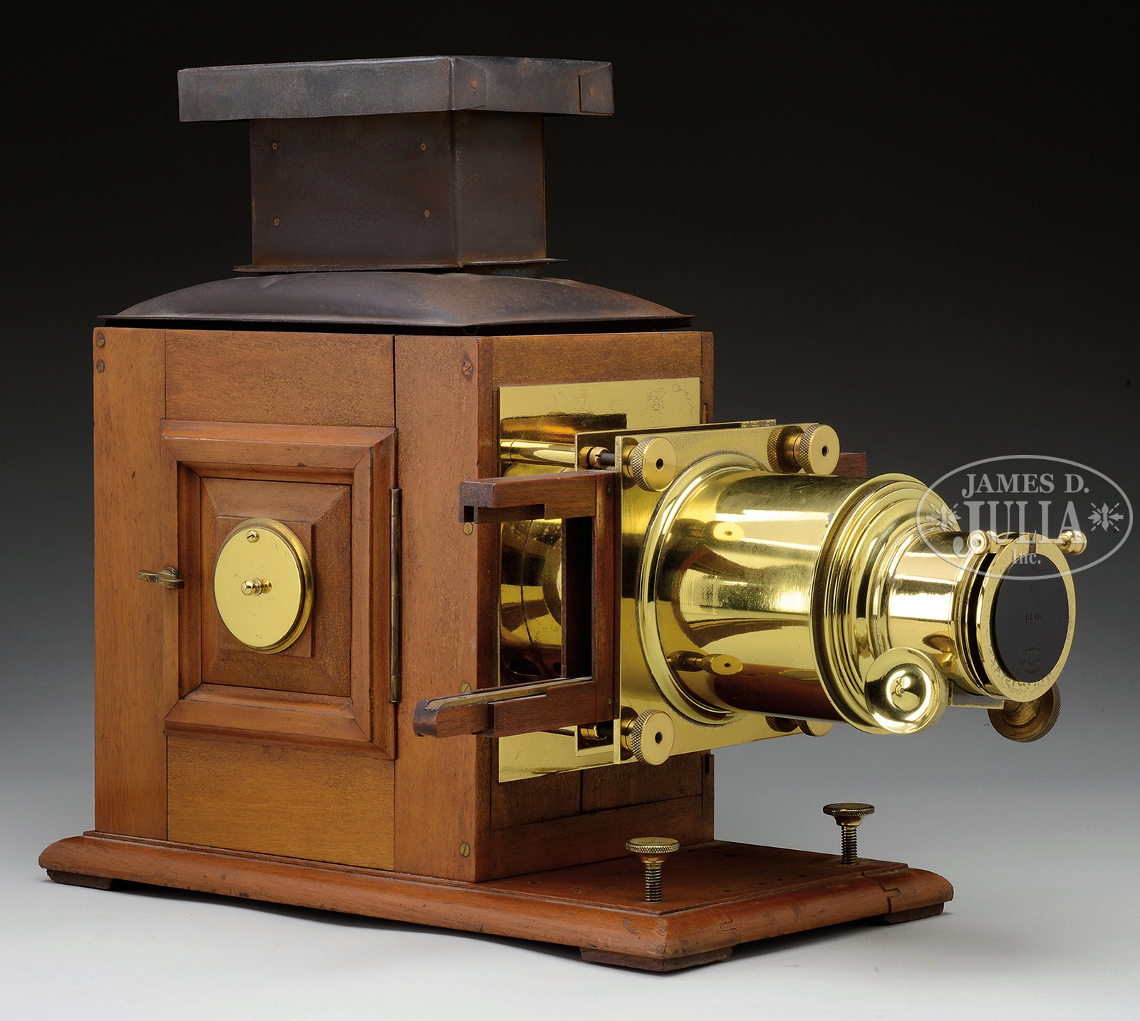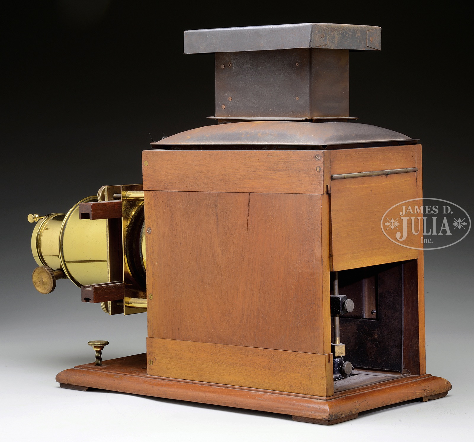 MAGIC LANTERN.Early projector consisting of a wooden cabinet with polished brass hardware and formed tin chimney. Marked “London Made”. SIZE: 16-1/4″ l x 13″ w x 12-3/4″ h. CONDITION: Overall very good. Lens unit is loose in threaded housing and does stay put. 48931-1 (500-1,000) – Lot 2082 Auction: Advertising, Toy & Doll - Spring 2015 Please Note: All prices include the hammer price plus the buyer’s premium, which is paid by the buyer as part of the purchase price. The prices noted here after the auction are considered unofficial and do not become official until after the 46th day. |