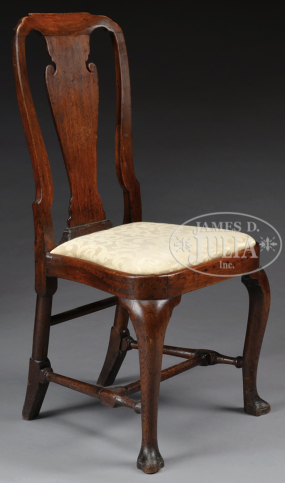 18TH CENTURY BALLOON SEAT QUEEN ANNE SIDECHAIR WITH DUCK FEET.Side chair with urn splat, flattened balloon slip seat, having cabriole legs ending in duck feet. SIZE: 39-1/2″ h, 17-1/2″ seat. PROVENANCE: From a fine Kentucky Estate. CONDITION: Fine old chair with good surface having evidence of minor repairs. 9-92294 (500-800) – Lot 2083