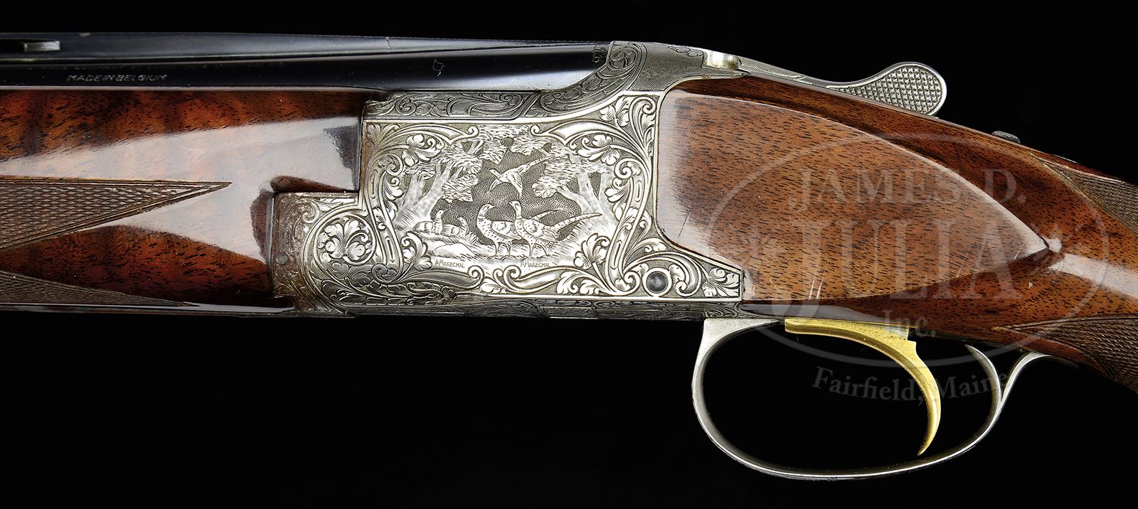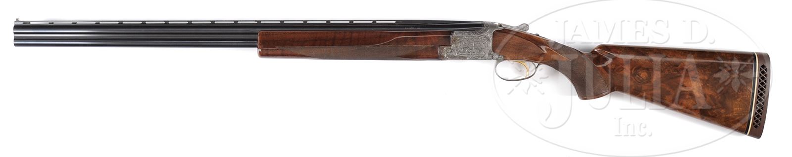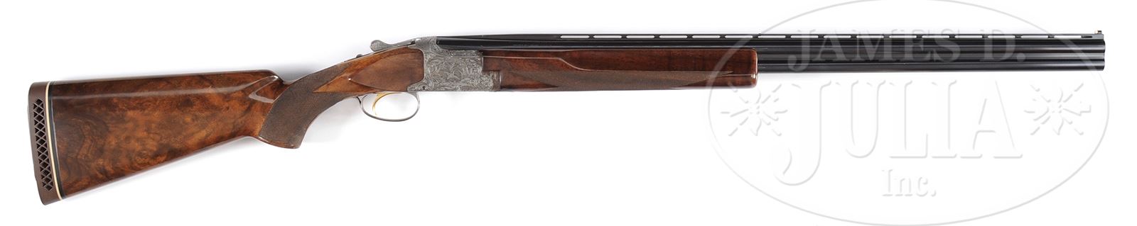 *BROWNING DIANA SKEET GUN.SN 4777V8. Cal. 20 Ga. 28″ bbls with ventilated rib. 2-3/4″ chambers. Synthetic ivory front and “certifiable pre-ban ivory” middle bead, single selective trigger, auto ejectors and non automatic safety. Skeet style forend. Receiver engraved in traditional Diana pattern double signed by “A MARECHAL” on left, once on right. LOP 14-3/8″ over Browning pad. FKST stock configuration. Nicely figured buttstock showing a few minor bumps from hunting over the years. Weighs 6 lbs 8 oz. 1968 vintage. Top: choke SKEET. Bottom: choke SKEET. PROVENANCE: William Henkel Collection. Special Note: This item contains or is made of ivory. Do not bid on this lot unless you have read and agreed to our "Ivory Position Statement" and the "Waiver of Legal and Financial Risk to James D. Julia in regards to your Purchase of an Ivory Object." This information is located in the front section of our catalog. CONDITION: Good. Forend salt wood with some discoloration and shrinkage which has caused some corrosion to forend metal and front of frame. Overall gun shows some light hunting wear. Mechanics fine. 49394-2 JSL8 IVORY (2,000-3,000) – Lot 2083