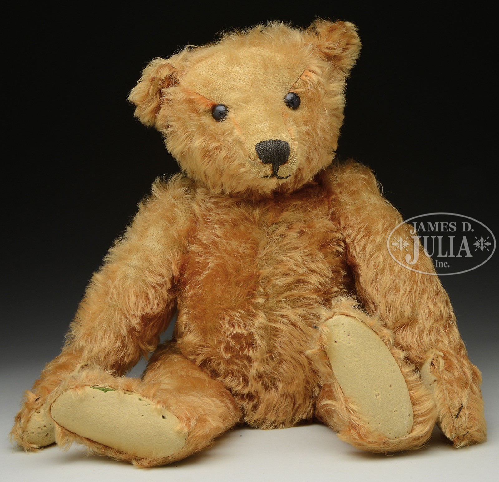 PRECIOUS AND EARLY APRICOT STEIFF TEDDY BEAR WITH IDS.This circa 1907 Steiff Teddy bear is made from the most delightfully colored apricot mohair which only adds to his glowing personality. The bear has classic early Steiff proportions, including long arms with spoon shaped paws, narrow cardboard lined feet, and a prominent back hump. His face is detailed with black shoebutton eyes, a shaved muzzle, and a black hand-embroidered nose and mouth. He has four claws on each paw but is now missing one on each foot. This bear has a particularly heartwarming presentation. He retains his tiny trailing “F” Steiff button and traces of his white ear tag as his Steiff IDs. SIZE: 19″ h standing; 13″ h sitting. PROVENANCE: From a fine collection. CONDITION: As noted. General mohair thinning and loss, especially on limbs and forehead. Some excelsior separation in limbs. Very small open seam on shoulder. Both hand paws with numerous holes; feet paws with very minor holes and splitting at cardboard edges. Otherwise fair to good. 47325-5 (1,000-2,000) – Lot 2084 Auction: Advertising, Toy & Doll - Spring 2015 Please Note: All prices include the hammer price plus the buyer’s premium, which is paid by the buyer as part of the purchase price. The prices noted here after the auction are considered unofficial and do not become official until after the 46th day. |