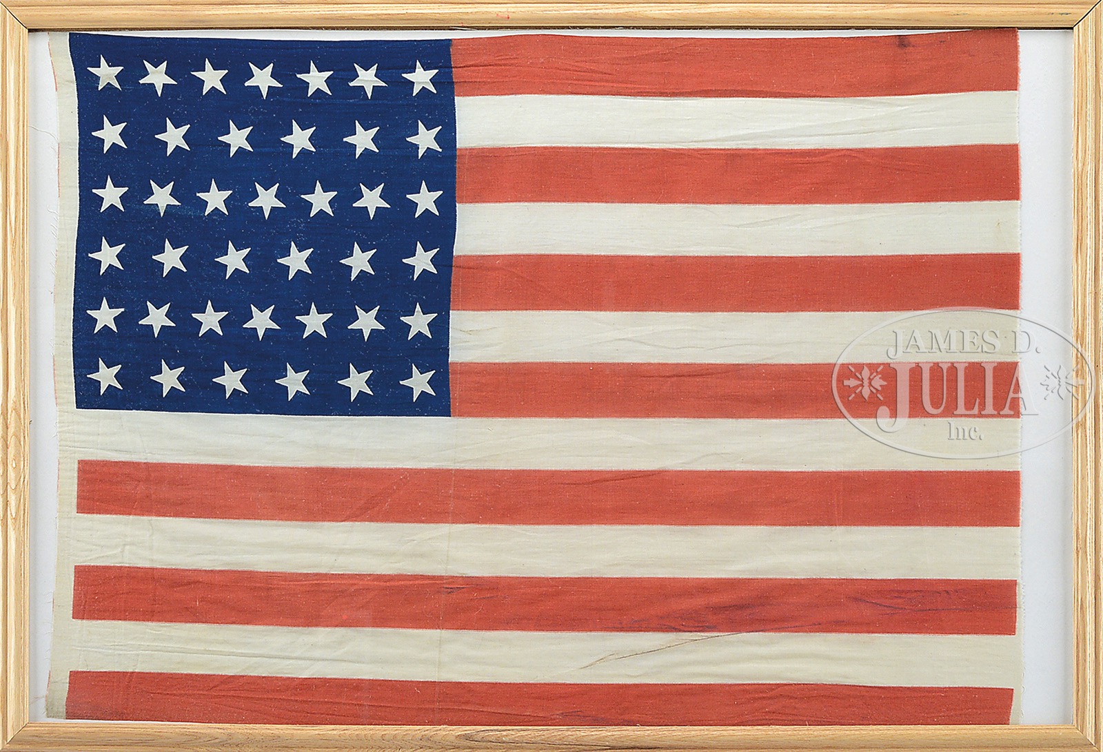 All flags in this group are printed and all are in fine condition with great aesthetics. 1) 44-star “Drum” design canton with star configurations 6-8-8-8-8-6. This flag commemorates the state of Wyoming and was official 1891-96. 2) 46-star “Drum” design canton with star configurations 7-8-8-8-8-7. This flag commemorates the state of Oklahoma and was official starting in 1908. 3) 45-star staggered pattern commemorating the state of Utah which was official 1896-1908. 4) The earliest flag is a 39-star commemorating North Dakota in 1889. The canton is in a wave pattern of columns 7-6-7-6-7-6. Two different sized stars along with column height make this flag look like it’s waving in the breeze. 5) 42-star flag commemorating state of Washington 1889-1890. The canton is an unusual staggered pattern of 6 rows of 7 stars. 6) 46-star flag commemorating state of Oklahoma and was official 1908-1912 and measures. SIZE: Flags: 1) 20″ x 13″. 2) 14-3/4″ x 19-1/2″. 3) 17-1/4″ x 26-1/2″. 4) 17-1/2″ x 33-1/2″. 5) 18″ x 34-1/2″. 6). about 24″ x 35″. Frames: 1 & 2) 20″ x 26″. 3) 24″ x 30″. 4, 5 & 6) 25-1/2″ x 38″. PROVENANCE: The Timothy Gallagher Collection. CONDITION: Overall all flags are fine. The 39 star flag has light staining and light yellowing with iron rust from nail holes where it was attached at hoist. Frags were not removed from frames, but otherwise all appear very good and above average. 51371-28 (2,000-3,000) – Lot 2084