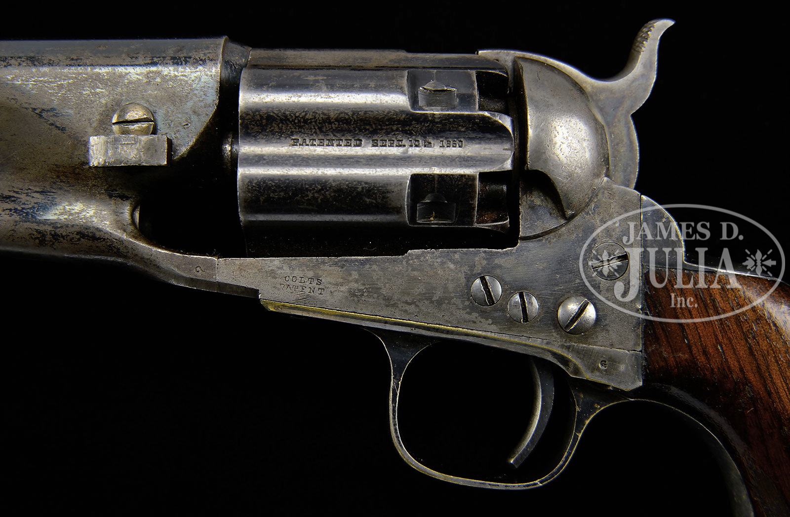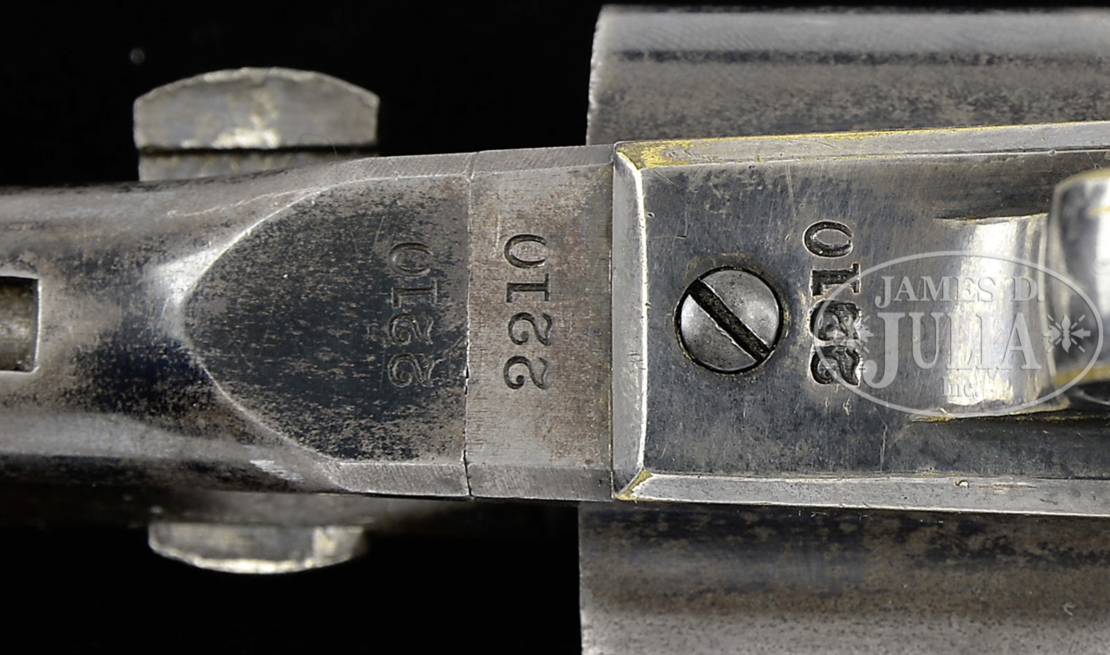 FINE COLT MODEL 1860 FLUTED ARMY PERCUSSION REVOLVER.SN 2210. Cal. 44. Usual configuration with 8″ rnd bbl, German silver front sight and 1-line Hartford address with dashes. Frame is 4-screw style cut for shoulder stock. Left side of frame has a tiny “COLTS PATENT”. Cyl is 6-shots, and full fluted with SN in one flute and a patent date in another. The silver plated brass trigger guard & steel backstrap contain a varnished 1-pc walnut grip with matching SN in backstrap channel. According to The Book of Colt Firearms, Wilson, there were about 4,000 Model 1860 Colts ever made of minor variance. This configuration with 8″ bbl was the most popular.Given that this model of Colt made its debut shortly before the onset of the Civil War and there are records of several deliveries to Southern distributors, some just days before the shelling of Fort Sumter, these earliest fluted Armys are considered to be possibly Confederate arms. This gun possibly could be researched from Colt and other sources that have listed many fluted SNs over the years. This gun does have a name carved lightly into right stock and scratched into buttstock. The last name “Dorsey” is easily discerned and initials “WD” are carved into buttstrap; so it might be possible to ascertain which “W. Dorsey” carried this gun in the Civil War. Regardless who carried this gun during the Civil War, this is a very high condition gun for a fluted Army that no doubt saw service. PROVENANCE: Norm Flayderman Estate Collection. CONDITION: Fine, all matching including wedge, cyl & grip. Bbl and cyl retain about 40% bright orig blue turning to gray/plum. Cyl has patent information & SN stamped into opposite flutes, both being quite discernible though SN is lightly struck. SN’s and other markings on gun are well struck and easily discerned as can be seen in photographs. The frame retains 30-40% muted and bright case colors with balance a silver/gray with scattered staining and pinprick pitting. Loading assembly exhibits traces of muted case color with balance being a smooth silver/gray. Trigger guard and backstrap retain 90% plus orig silver plating with some bubbling on backstrap near butt. Grips are sound and well fit showing light to moderate edge wear retaining 90% plus orig varnish with the lightly carved name “DORSEY” easily discerned. Mechanics are fine, strong bright bore with crisp rifling. 4-51155 JS65 (8,000-12,000) – Lot 2086