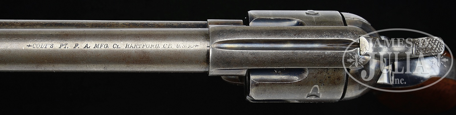 EARLY COLT SINGLE ACTION ARMY REVOLVER MADE FOR THE ENGLISH MARKET.SN 21698. Cal. 450 Boxer. Blue & color case hardened with 7-1/2″ bbl, full front sight & 1-line script address with serifs. Bottom of bbl, under ejector housing, has last 4 digits of matching SN. Ejector housing is first type with bullseye ejector rod head. Base pin is orig type with dimpled ends. Left side of frame is marked with the early 2-line patent dates & left shoulder of trigger guard “45 CAL / B”. Right side of frame, most unusually, is marked with 2 crown-V British view proofs. The cyl has a proof in 1 flute. The bbl was not proofed. Mounted with varnished 1-pc walnut grip that has matching SN in backstrap channel. According to Colt Peacemaker Encyclopedia, Cochran, there were only 729 out of the more then 350,000 single action Army revolvers produced 1873-1941 chambered for this Cal. Given that this Cal. was not overly popular in the U.S., it can be stated with some certainty that the majority of the revolvers so chambered were shipped to England. Few have returned to the U.S. PROVENANCE: Accompanied by a Colt factory letter stating Cal.45 Eley, Blue Finish, “Long Barrel”, Shipped to Colt’s London Agency June 8,1876 in a 25 gun shipment. CONDITION: Fine to very fine, all matching including bbl, cyl & grip. Bbl retains 20-25% orig blue, strong & bright under the ejector housing with a band at the bbl root & traces around the front sight. Ejector housing retains thin blue in the top gullet with strong blue in the bottom gullet and a blue/grey patina on the outer radius. Frame retains 70-75% orig case colors, bright in the more sheltered areas, faded elsewhere. Screws show no abuse & retain most of their orig fire blue. Hammer retains brilliant case colors on the right side & rear edge, lightly faded on left side & turned dark on top edge. Cyl retains strong blue in the flutes showing a blue/grey patina on the outer diameter & retains most of its orig blue in the chambers. Trigger guard & backstrap retain about all of their orig blue, a little thin on the trigger bow & center of backstrap with wear at the heel & toe. Grip is sound showing moderate edge wear with a deep scratch on the left side & a few scattered bruises on the right side with other light nicks & scratches & retains about 90% strong orig varnish. Mechanics are fine. Brilliant shiny bore shows very little use, just lots of handling. 50138-3 JR128 (8,000-12,000) – Lot 2086 Click here to view provenance