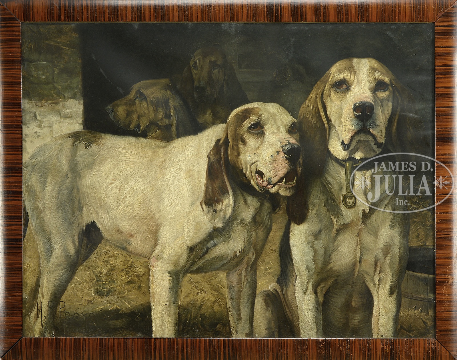 SCARCE H.R. POORE WINCHESTER BEAR DOGS PRINT.Iconic Winchester print used in a variety of Winchester advertisements with exposed image 34-1/4″ x 26-1/4″ in its faux striped period frame. Image depicts two large brown and white “bear dogs” in the foreground and two large brown dogs that may be bloodhounds in the background, in a barn setting. These dogs were reportedly part of the Winchester family hunting pack. Overall dimensions of the frame are 37-1/2″ x 29-1/2″. CONDITION: Front has one tiny chip on the right at barrel and small chip beneath signature. Otherwise, appears to be fine with little or no fading or soil. Frame is sound with dark crackled varnish. 51078-1 TDW (2,000-4,000) – Lot 2087