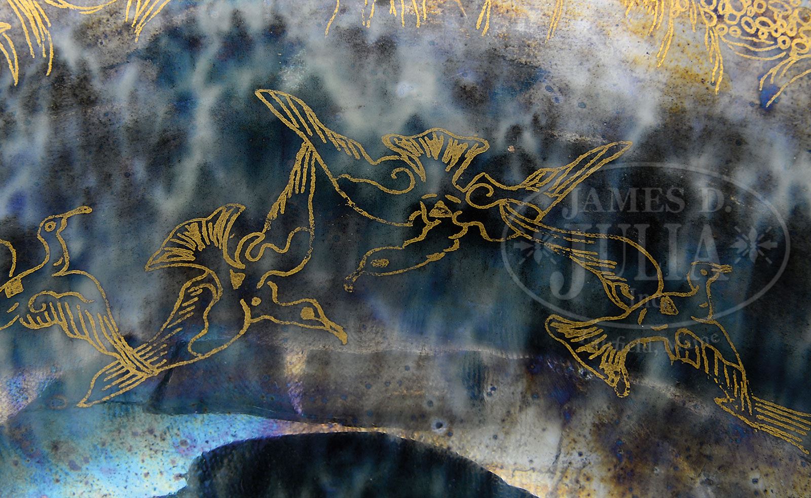 WEDGWOOD FAIRYLAND LUSTRE LILY TRAY.Wedgwood lily tray is decorated on the interior in the Garden of Paradise pattern with pillars forming 3 panels decorated with fairies flying among the trees with a gondola at shores edge and a purple idol figure looking on. Tray is decorated on the exterior with a gilded band of birds in flight against a mottled blue and green glazed background. Signed on the underside with gold Portland vase mark “Wedgwood England Z4968”. SIZE: 11″ dia. CONDITION: Some wear to gilding on bottom of bowl as well as some minor scratches. 5-69824 (3,000-4,000) – Lot 2088
