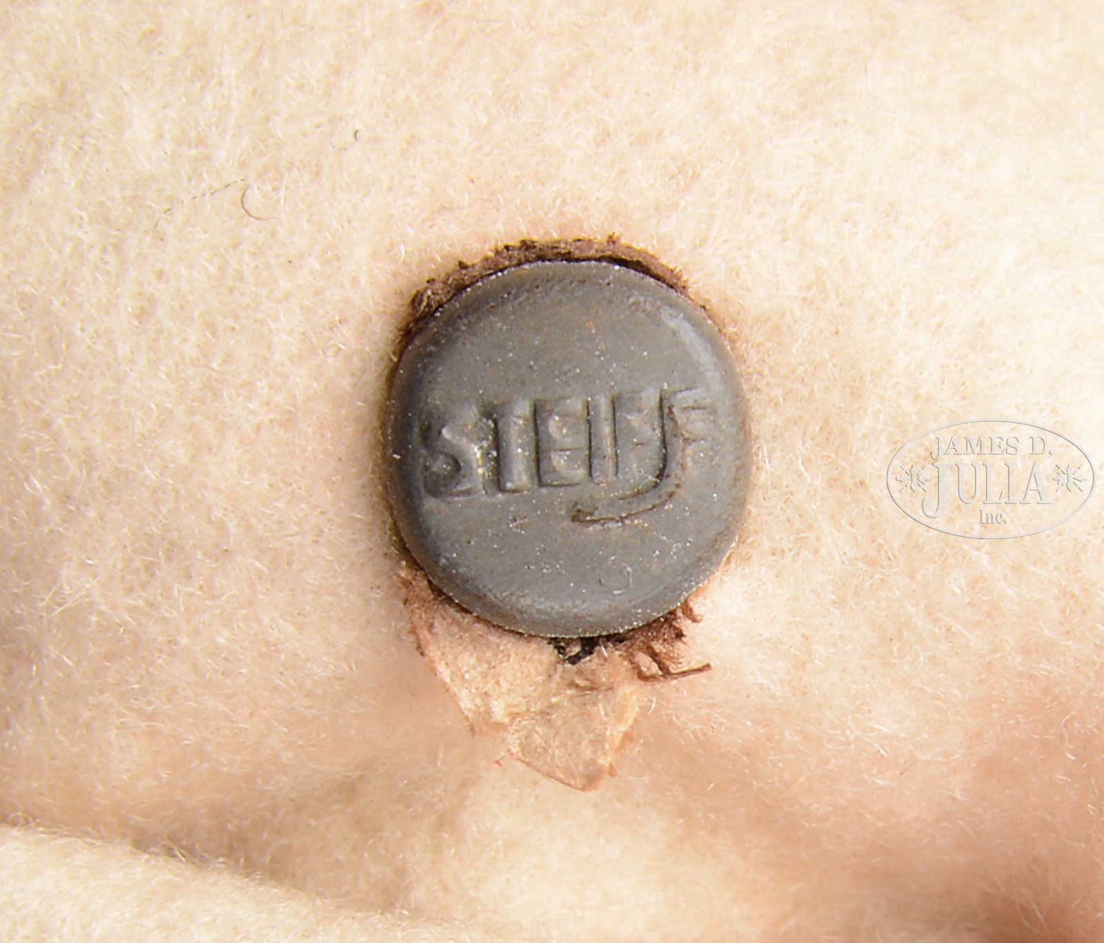 LARGE AND VERY APPEALING STEIFF RIDING LAMB WITH IDs.Circa 1930s, Germany. A standing, unjointed lamb on a metal riding carriage with a wooden steering handle. Lamb is made from white lamb’s wool plush. Her face, ears, and lower legs are made from short white mohair. Her authentic face comes to life with green and black glass pupil eyes, hand embroidery, and airbrushing. She has leather hooves and a working pull voice. Her bell is most likely original. The lamb rides upon four red metal wheels. With Steiff long trailing “f” style button and traces of her paper ear tag. This model was produced in 9 sizes ranging from 14 to 80 cm from 1930 through 1943. This model is an impressive size and would make a delightful focal point in a nursery, country home, or in a springtime vignette display. SIZE: 22″ h (56 cm) x 26″ w (66 cm). CONDITION: Fair to good. Wear consistent with age and nature of item. Plush wear and losses, especially on the back riding area. One hoof with small hole. Home repairs on seams. 49040-3 (750-1,000) – Lot 2088 Auction: Advertising, Toy & Doll - Spring 2015 Please Note: All prices include the hammer price plus the buyer’s premium, which is paid by the buyer as part of the purchase price. The prices noted here after the auction are considered unofficial and do not become official until after the 46th day. |
