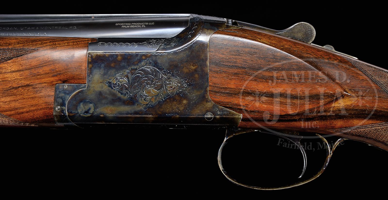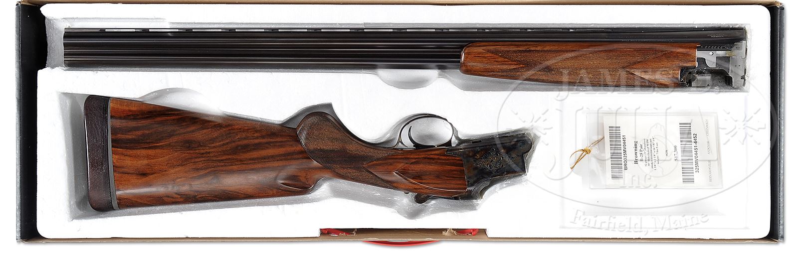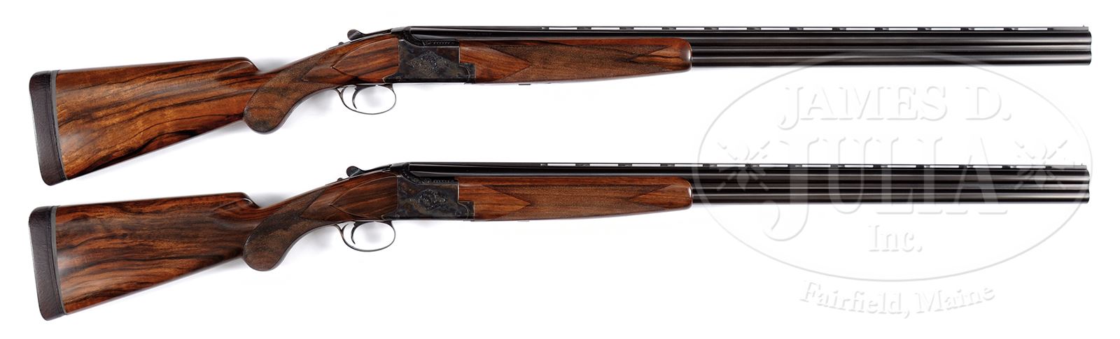*PAIR OF CUSTOM FINISHED BROWNING B-25 WITH ORIGINAL BOXES.SN 325MV04451/ 325MVO4452. Cal. 12 Ga. 3” Chambers. These traditionally finished guns have 30″ bbls marked for mod and Imod. Bbls have narrow, raised, matted, ventilated ribs fitted with single silver beads, and are marked with Browning Morgan Utah and Montreal addresses, as well as “MADE IN BELGIUM BY BROWNING S.A.” on left sides which are also marked with importers name and address. Right side is marked with model and chamber info. Rear portions of ribs are gold inlaid with “I” and “II”. These numerals also appear on top levers. Unusual, color hardened, slightly rounded, Browning OU actions with blued sgl selective triggers, are engraved with simple geometric borders framing patches of large shaded scroll. Well matched, oil finished, nicely streaked and lightly figured European walnut long tang round knob buttstocks measure 14-3/8” over russet leather covered pads, with thin tapered spacers. Point pattern checkering with line borders is at grips. Matching forends are of slim field type. Set “I”: Drop at heel: 2-1/8″, drop at comb: 1-3/8″. Weight: 7 lbs 7 oz. LOP: 14-3/8″. Set “II”: Drop at heel: 2-1/8″, drop at comb: 1-3/8″. Weight: 7 lbs 6 oz. LOP: 14-3/8″. Each gun comes in its orig black and red box with correct end labels. CONDITION: Excellent, near new, appear unfired since proof, with only a few light handling marks. Mechanically crisp. Boxes are very fine with tape. 49181-45 MGM444 (12,500-17,500) – Lot 2092