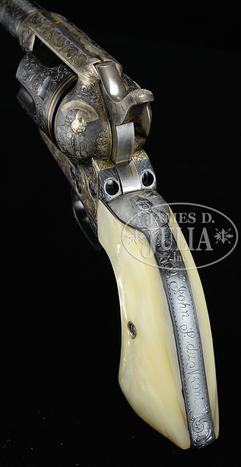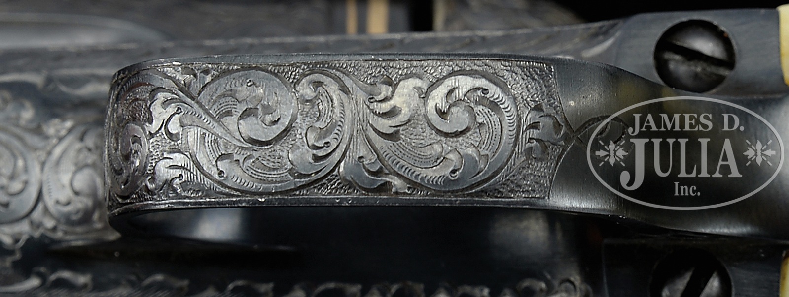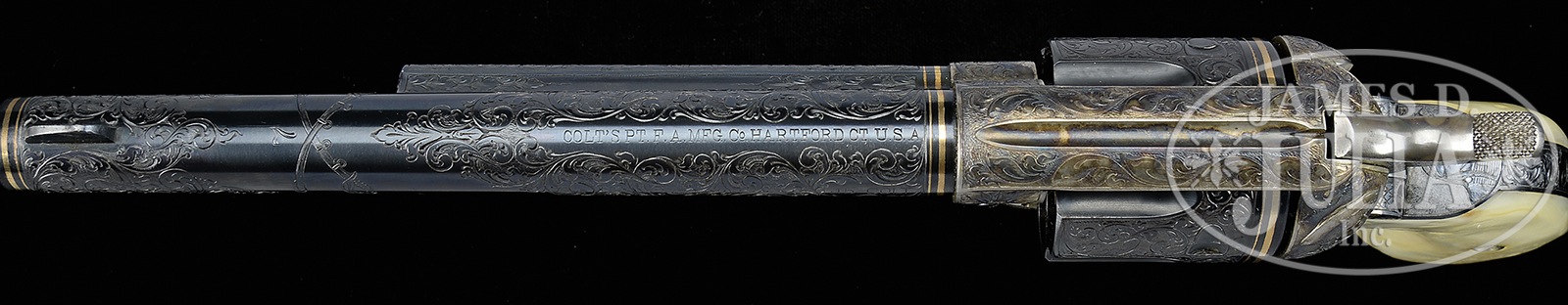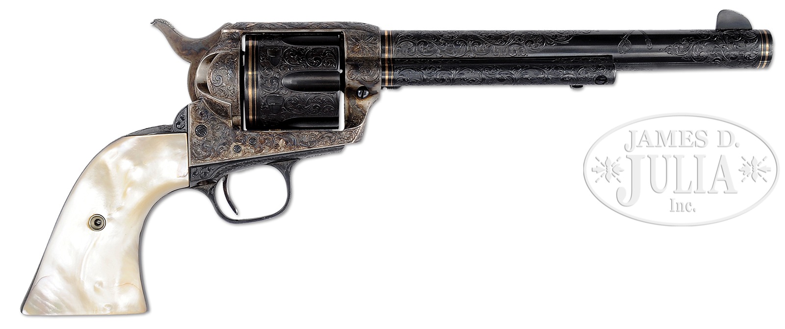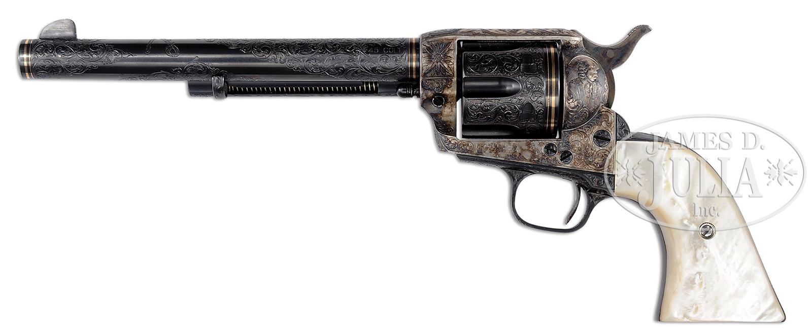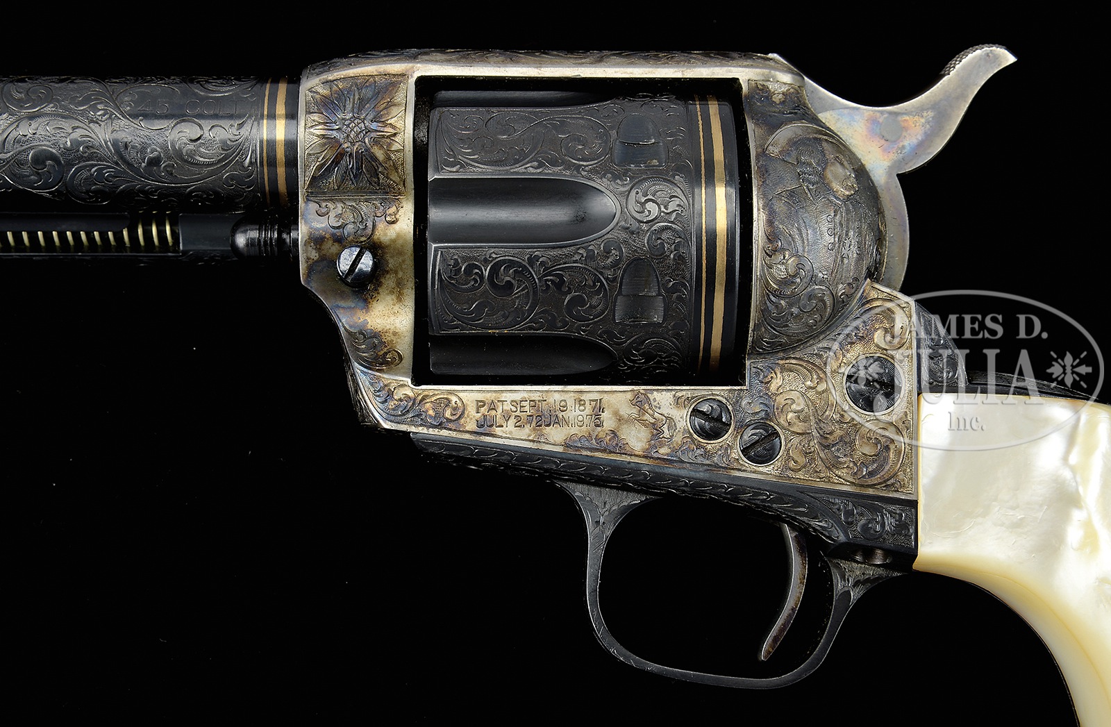 *RARE ALVIN WHITE ENGRAVED COLT SINGLE ACTION ARMY REVOLVER.SN 345974. Cal. 45 Colt. Blue & color cased hardened, 7-1/2″ bbl, full front sight, 1-line block letter address & Cal. marking on left side. Left side of frame has 2-line 3-patent dates and Rampant Colt without a circle. SN was observed on bottom of the frame and right sides of the front & back straps, under the grip. Last 2 digits of matching SN are on rear face of cyl. Left side of frontstrap, under the grip has Mr. White’s gold inlaid cartouche “AA WHITE / ENG.”. Mounted with smooth 2-pc pearl grips. Revolver is beautifully engraved by Mr. White with D-plus coverage, fine foliate & floral arabesque patterns that have fine shaded background. Left recoil shield is relief engraved with the figure of General George Armstrong Custer inlaid with silver hat and face, wearing a uniform with the shoulder straps of a Major General. Top of the backstrap has the relief engraved characterization of what appears to be Sitting Bull, a principal Indian player at The Little Big Horn. Top front of the bbl is engraved with crossed sabers surmounted by a “7”, the hat badge of the 7th Cavalry regiment. Cyl has 2 gold lines around the rear edge with 2 more at the bbl root and 2 additional bands at the muzzle. Backstrap is engraved in script “John S. du Mont”. John du Mont was a prolific author of firearm & Custer books and is considered “the Dean of Gun Collectors” and one of the early pioneers of gun collecting who amassed a marvelous collection of Colts and Custer memorabilia. Reportedly created for Mr. du Mont in the mid-1960’s. This is one of the finer examples of Mr. White’s work. Accompanied by a Colt Factory letter which identifies this revolver in Cal. 45 with 7-1/2″ bbl, blue finish, type of stocks not listed & shipped to Simmons Hardware Co., St. Louis, Mo on Oct 9, 1923 in 1-gun shipment. PROVENANCE: The Brad Shepherd Collection. CONDITION: Appears to be new and unfired since custom finishing showing virtually all of its fine custom finish with bright blues and muted case colors. Grips are sound showing good fire. Mechanics are crisp. Bright shiny bore. 50061-26 (12,000-18,000) – Lot 2093 Click here to view provenance