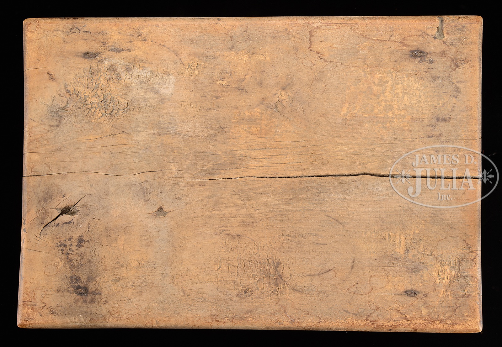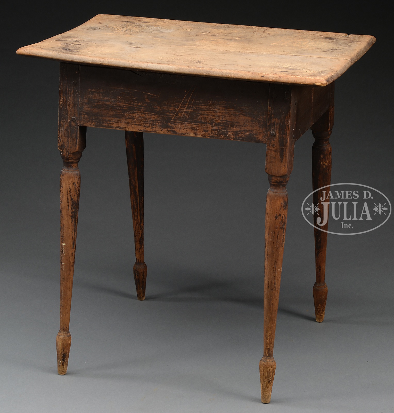 MAPLE SPLAY LEG TEA TABLE.Circa 1770. A choice country tea table with an attenuated delicate stance in original “as found” condition. Retaining original oxidized Spanish brown painted surface with considerable wear to legs and a single board scrub top. Materials are maple construction throughout. SIZE: 25-1/4″ h x 24″ l (at top) x 16-1/4″ w. PROVENANCE: Estate of Siro R. Toffolon of Old Lyme, CT. CONDITION: Intact with scrub top with significant age cracks and erosion from 100’s of years of use. 49476-74 (800-1,200) – Lot 2094
